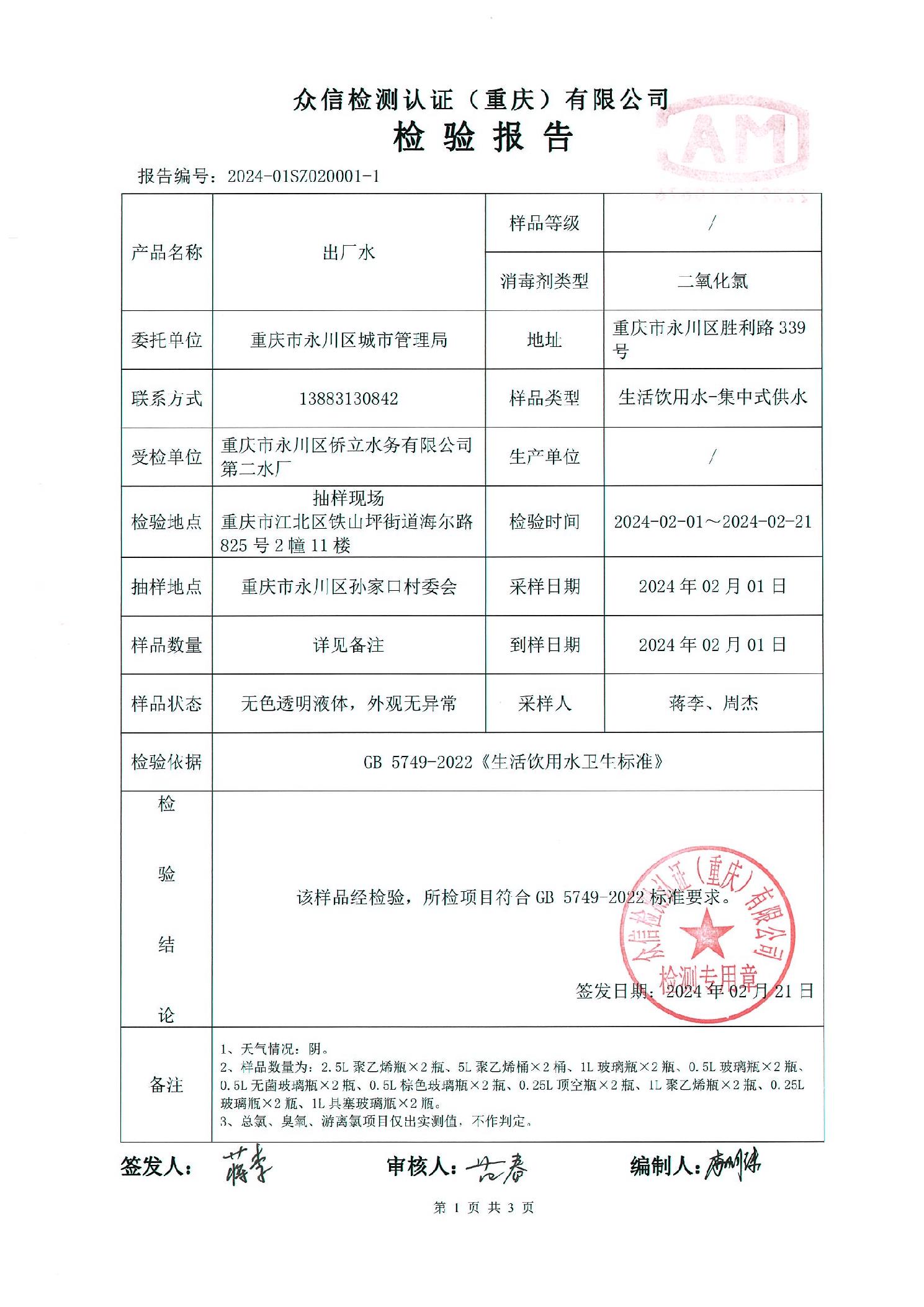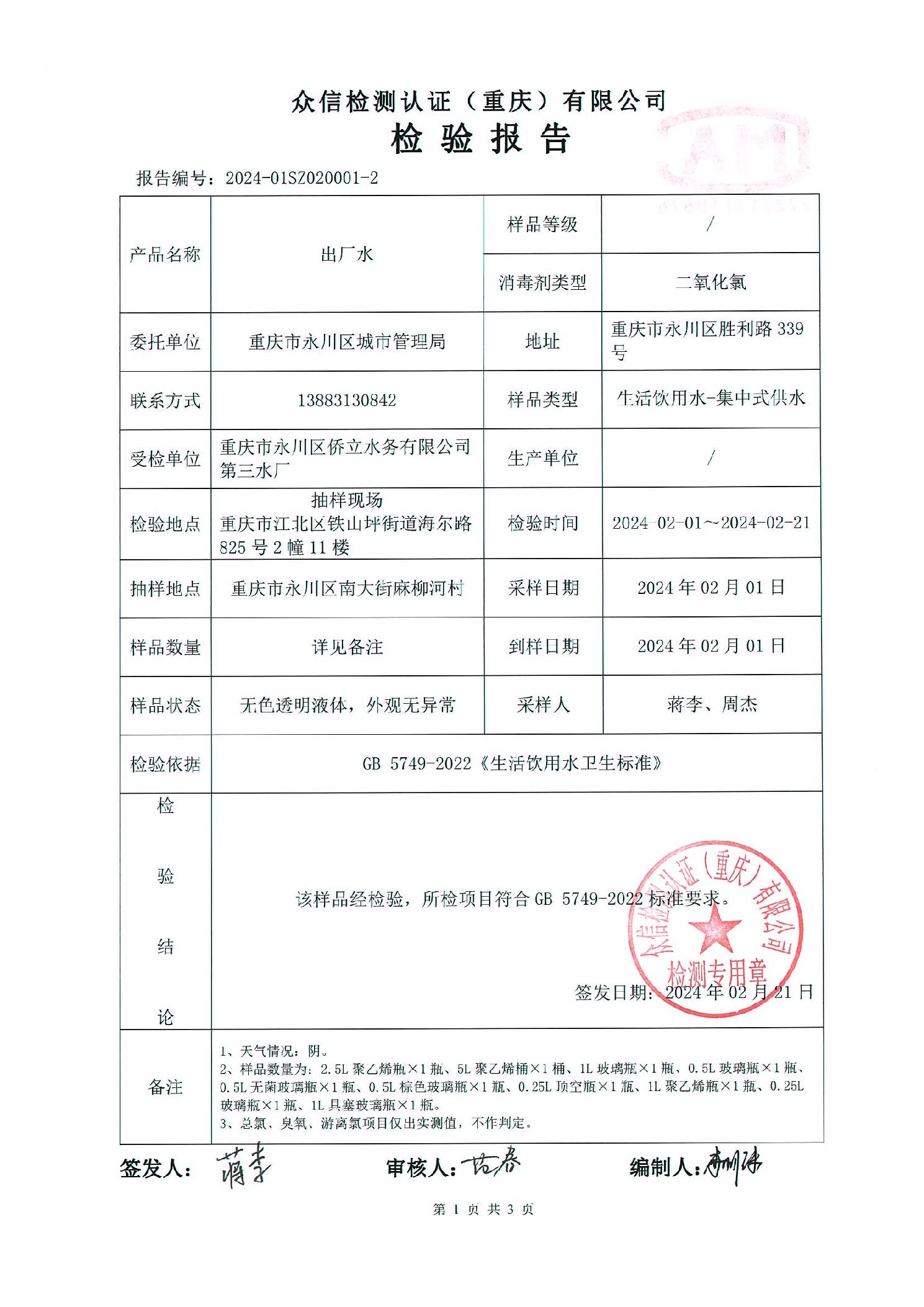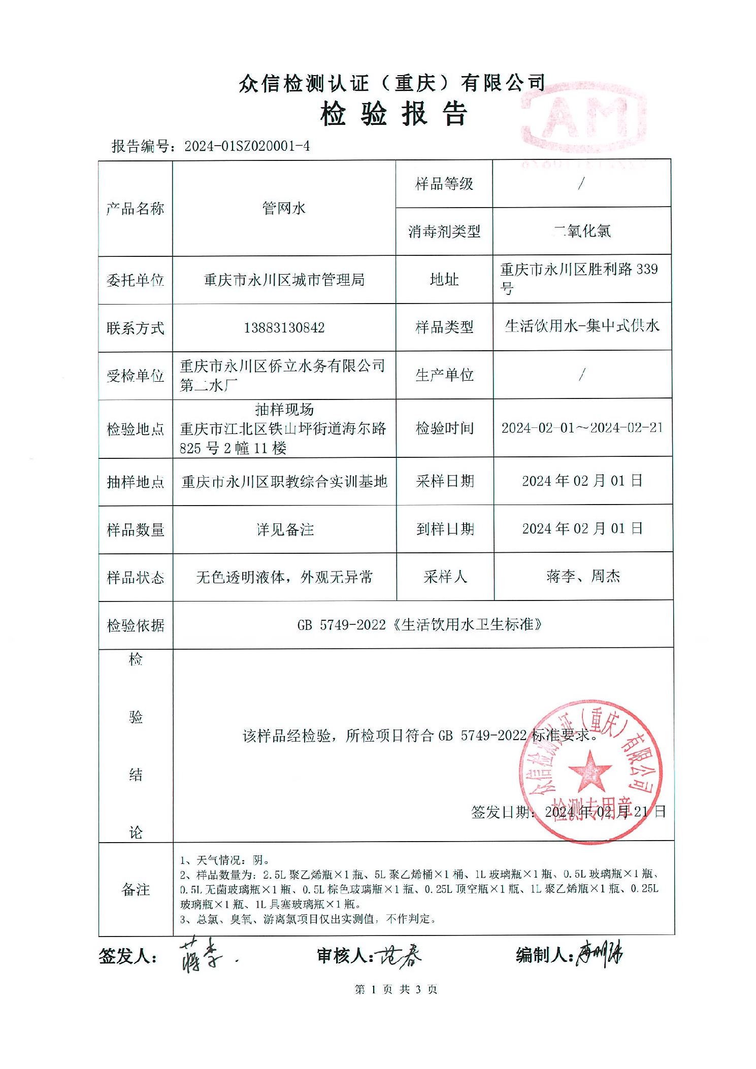 | 标题: | 重庆市永川区城市管理局关于2024年2月永川城区水质(出厂水、管网水)检测报告的公示 | ||||