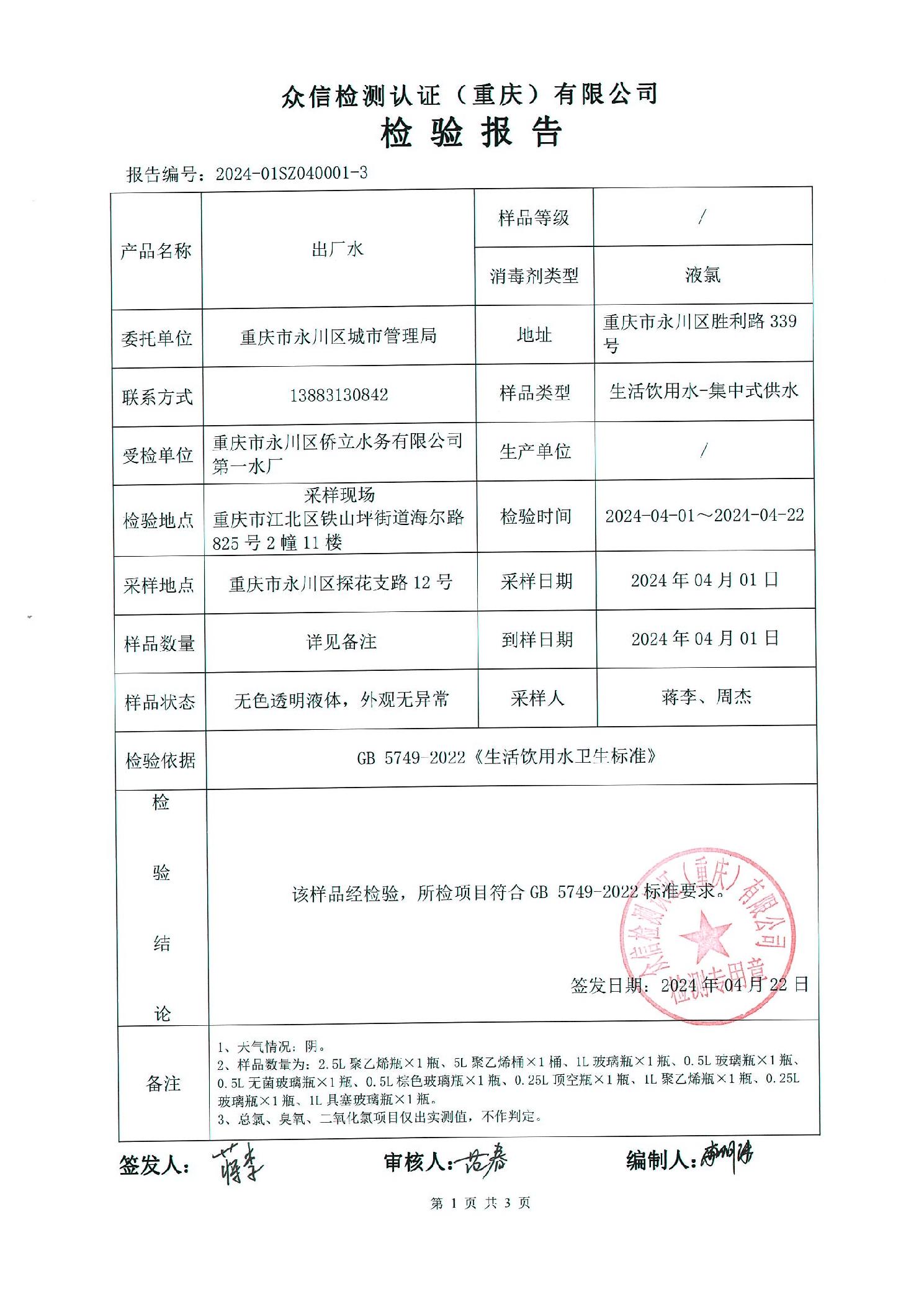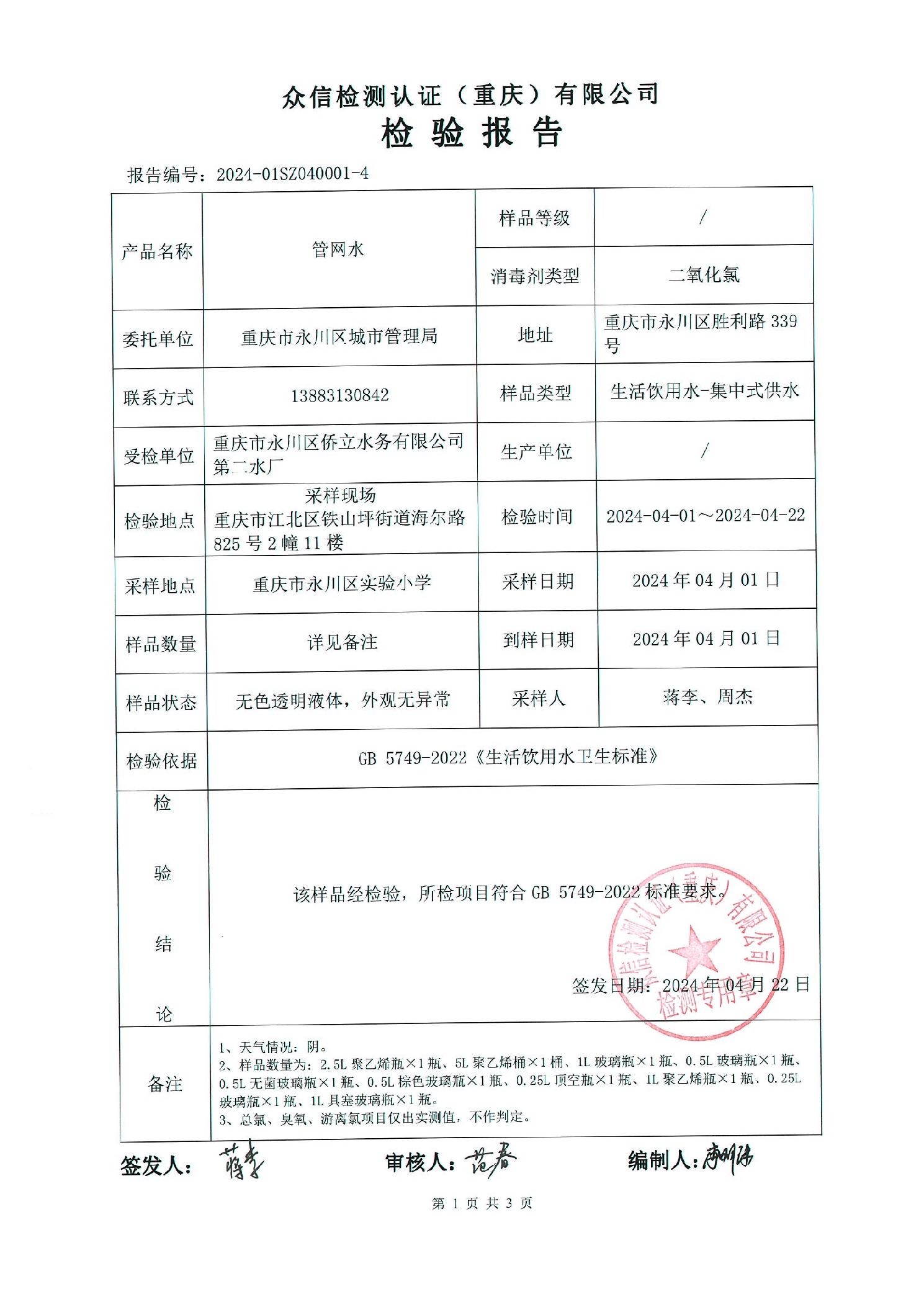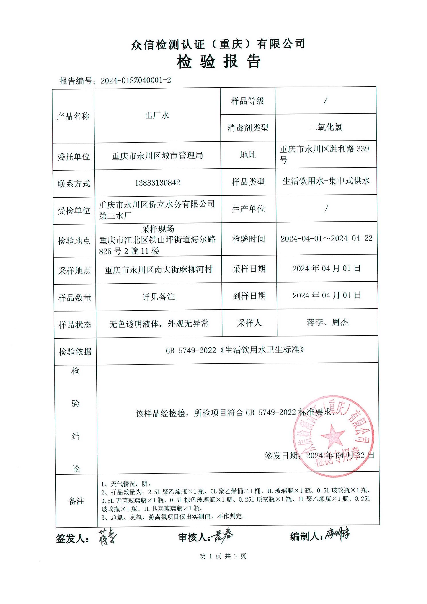 | 标题: | 重庆市永川区城市管理局关于2024年4月永川城区水质(出厂水、管网水)检测报告的公示 | ||||