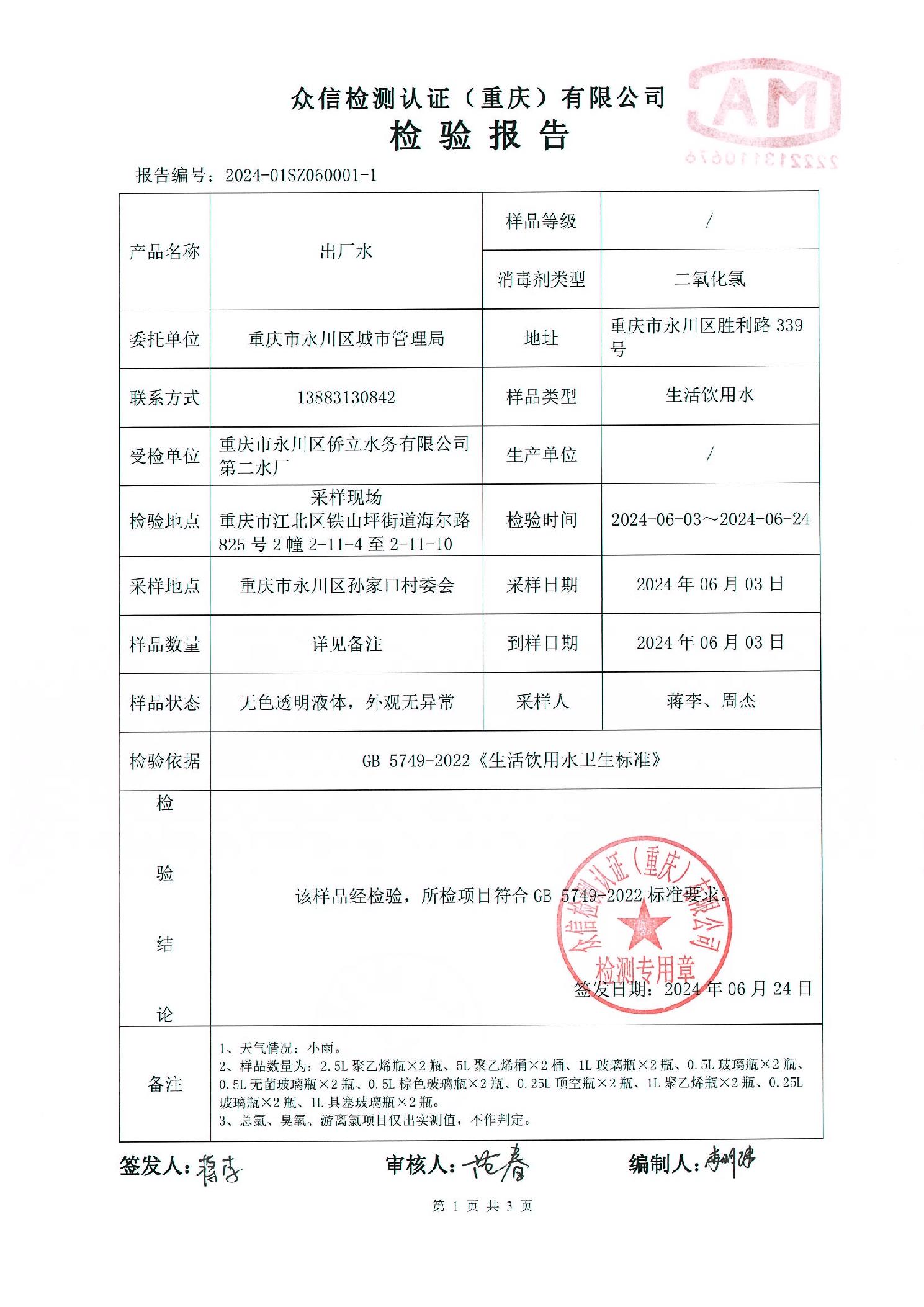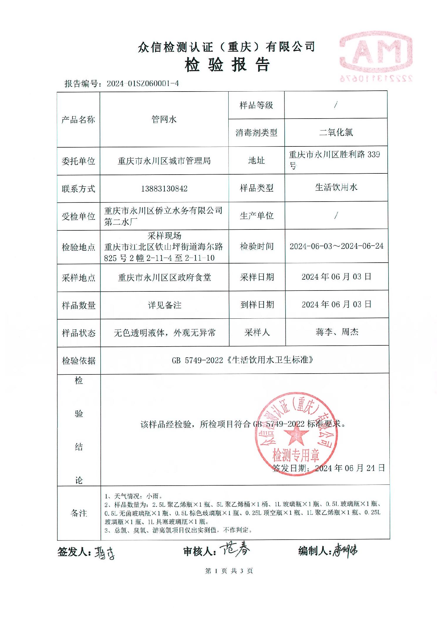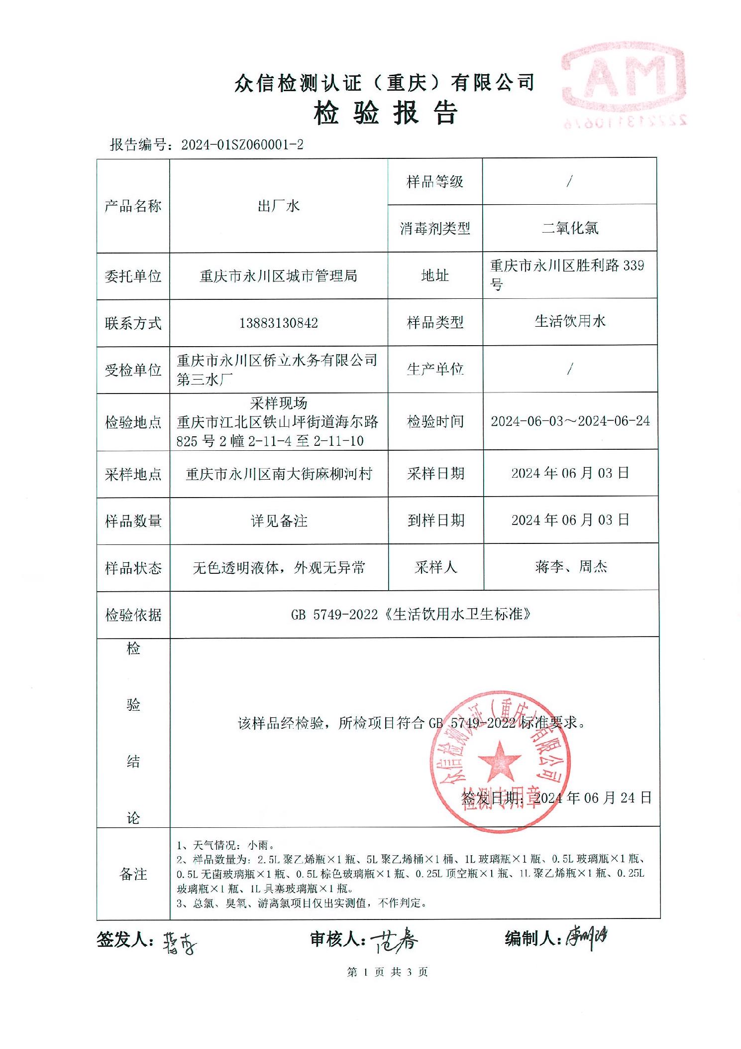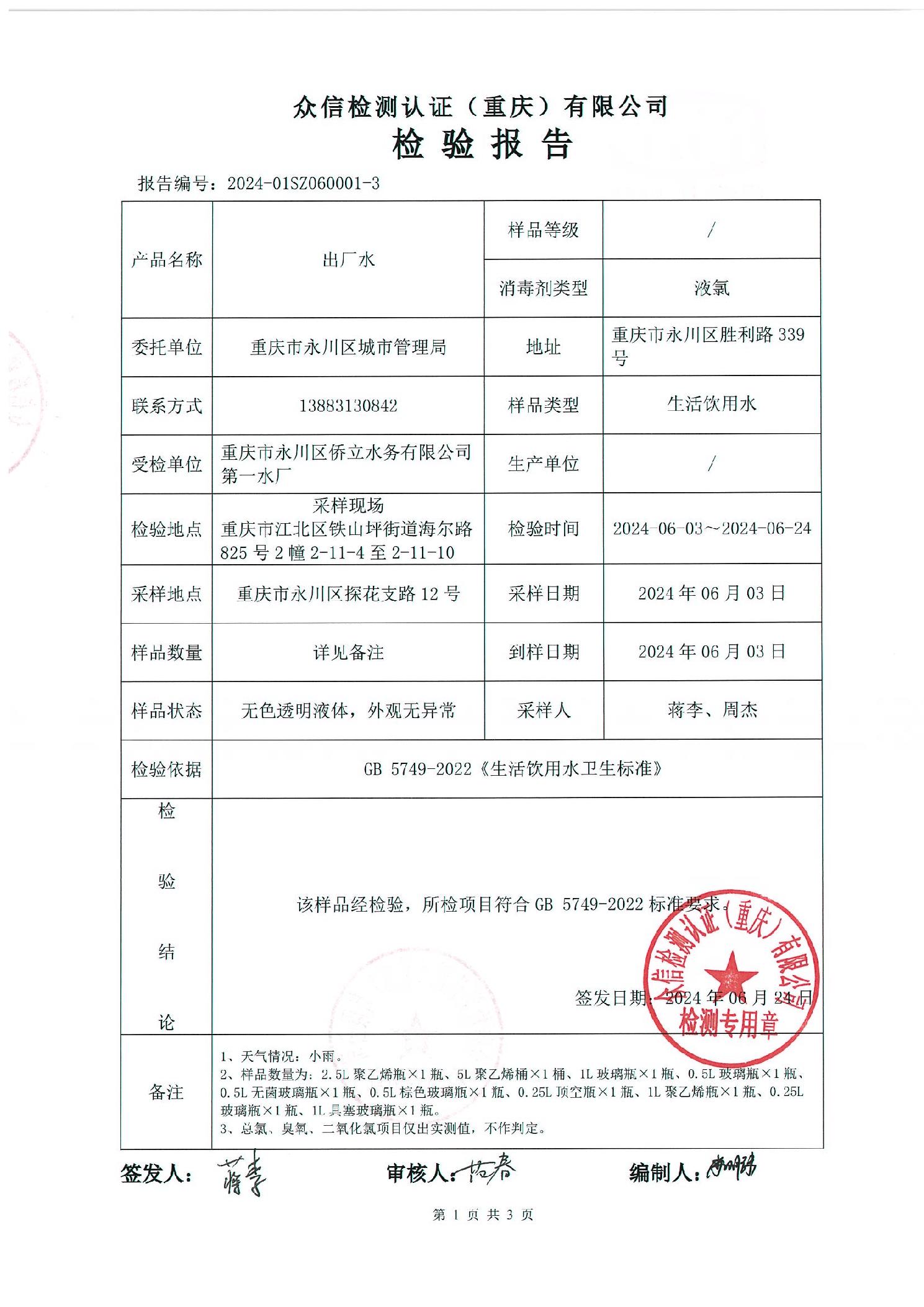 标题: | 重庆市永川区城市管理局关于2024年6月永川城区水质(出厂水、管网水)检测报告的公示 | ||||