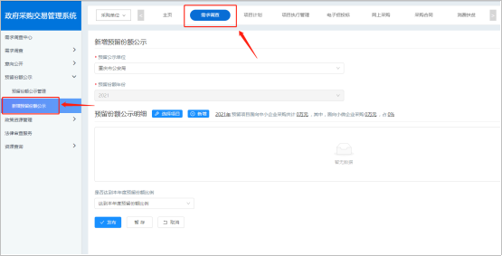 进入后台点击“需求调查”,选择“预留份额公示——新增预留份额公示”即可进入新增内容界面。