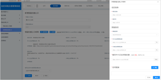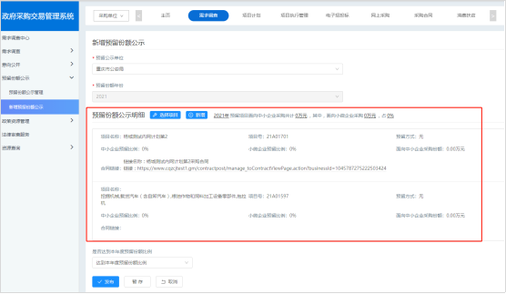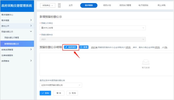 预留份额公示支持两种方式,第一种是直接选择项目号,系统自动读取预留份额情况;第二种是手动录入项目信息。