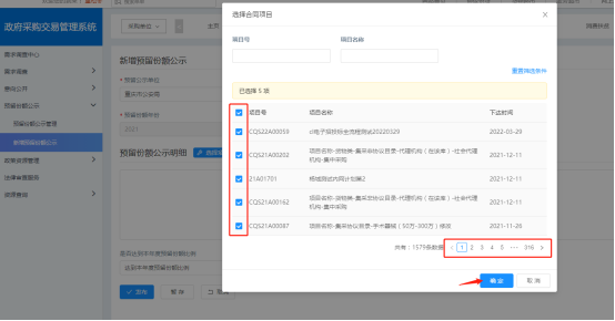 采购人需点击“选择项目”,系统自动罗列展示本单位“已登记合同的(执行完成)计划项目”。采购人可点选或多选所需公示的项目,也可点击右下角翻页按钮进行选择。(备注:若该笔项目预留份额为0,也需进行公示)