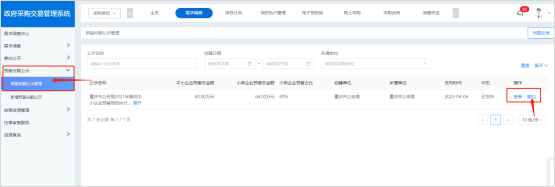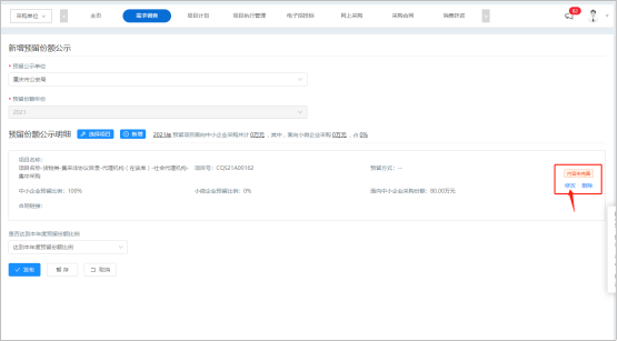 勾选完毕后,系统自动对接项目计划时填写的数据,采购人需点击“修改”,对本项目的预留份额情况、份额数据进行一一核对并确认实际执行情况。