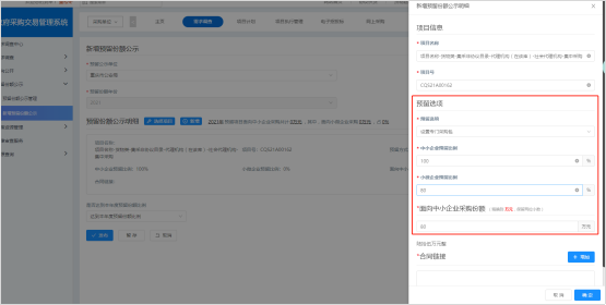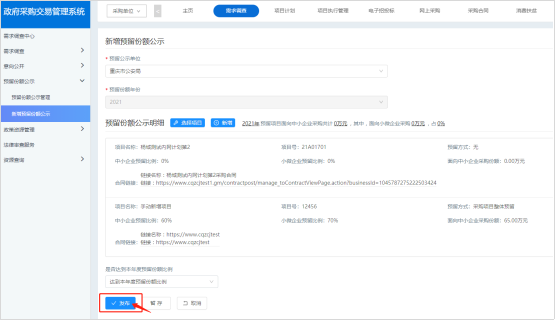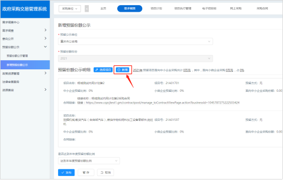 除了选择项目外,也可点击“新增”按钮,录入预留份额信息,包括项目名称、预留份额及合同链接等。