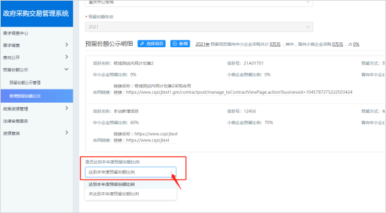 确认公示内容完整后,点击“是否达到本年度预留份额比例”选择达到或未达到。备注:预留份额公告一年只公示一次,当年公示前一年的预留份额执行情况。