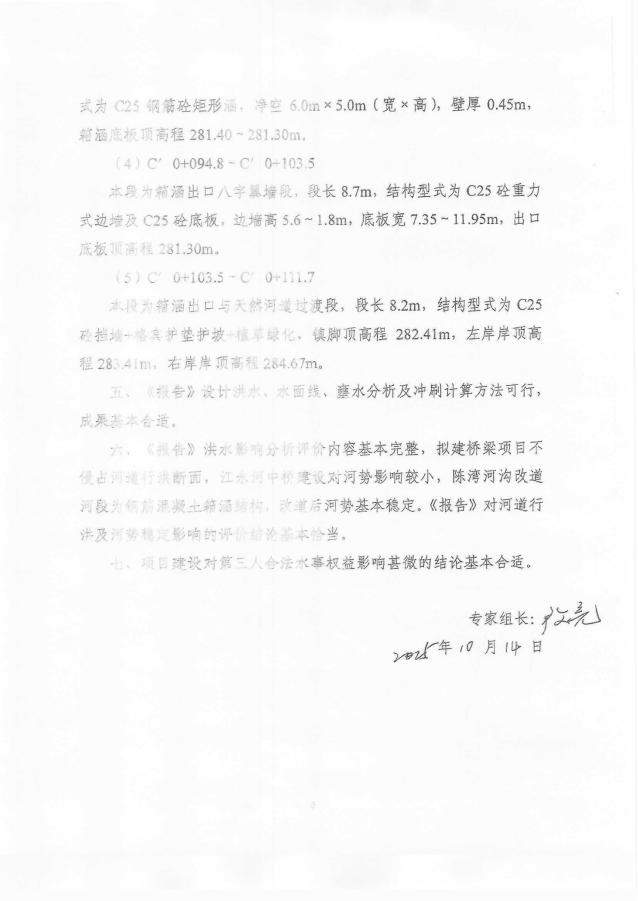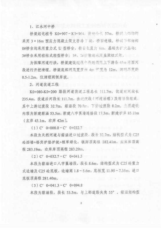 一、项目涉河工程位于永川区朱沱镇,涉及河道为江永河、陈湾河沟,同意河道防洪标准采用10年一遇;江永河中桥设计洪水标准为100年一遇;改道箱涵设计洪水标准为100年一遇,箱涵上下游过渡段护岸至现状地面。