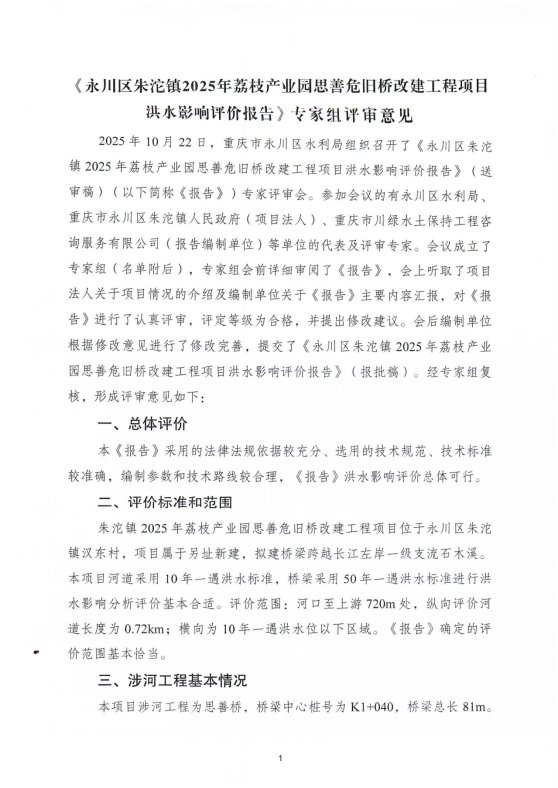 附件:1、永川区朱沱镇2025年荔枝产业园思善危旧桥改建工程项目洪水影响评价报告评审意见;