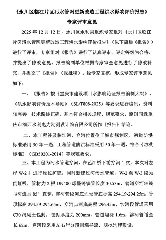 附件1:永川区临江片区污水管网更新改造工程洪水影响评价报告专家评审意见