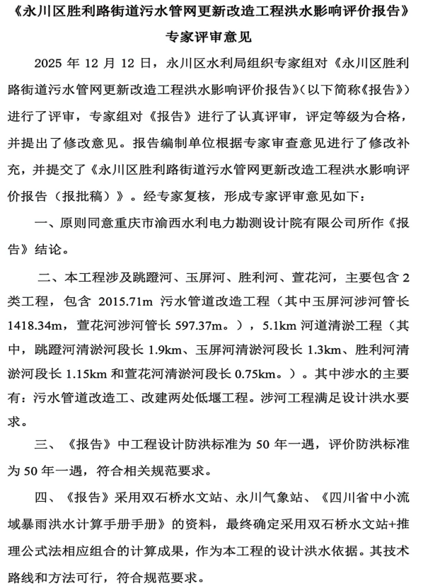附件1:永川区胜利路街道污水管网更新改造工程洪水影响评价报告专家评审意见