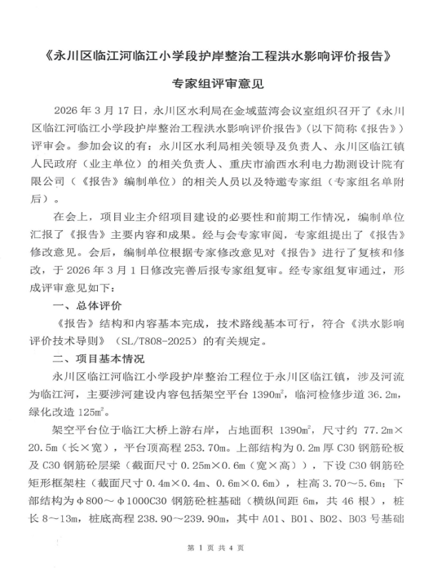 63782),我局组织专家对《永川区临江河临江小学段护岸整治工程洪水影响评价报告》进行了审查。根据《行政许可法》第三十八条第一款、《水行政许可实施办法》第三十二条第一项规定和专家评审意见,现就该工程洪水影响评价作出准予行政许可决定。