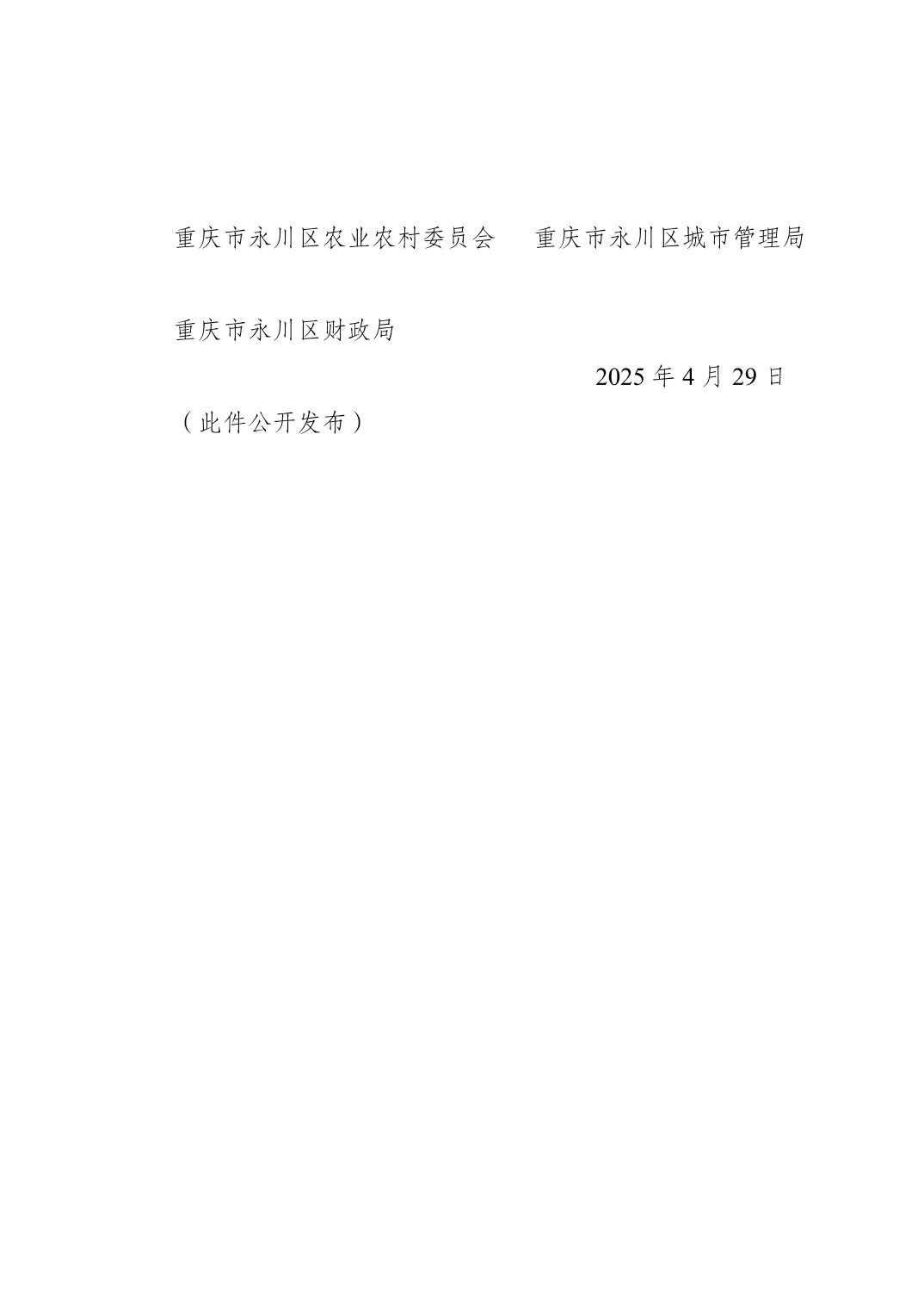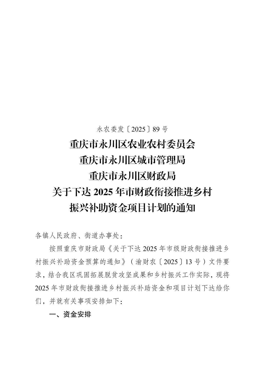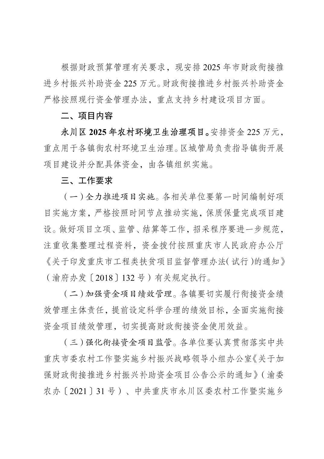 重庆市永川区农业农村委员会 重庆市永川区城市管理局 重庆市永川区财政局关于下达2025年市财政衔接推进乡村振兴补助资金项目计划的通知