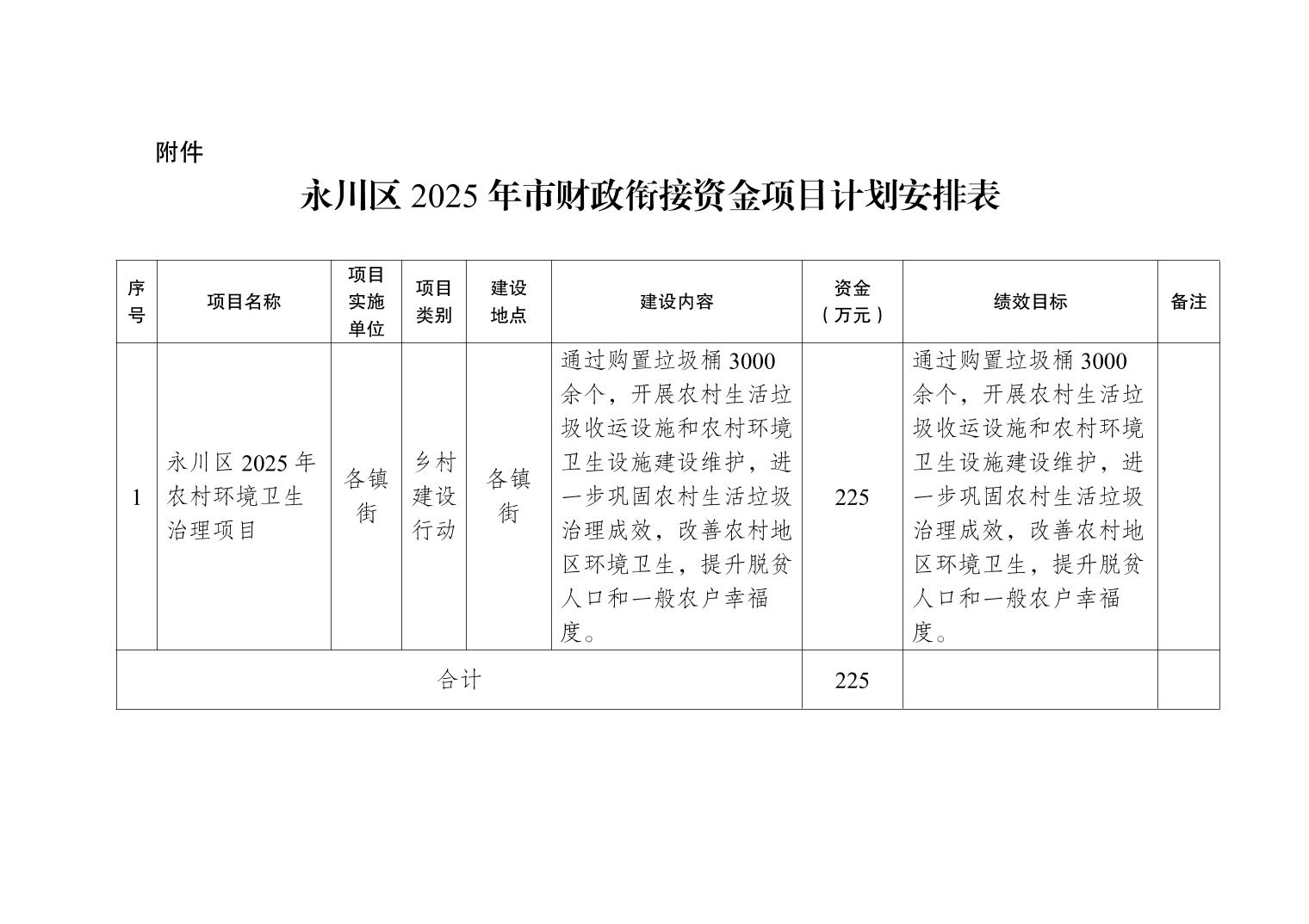 按照衔接资金公示公告相关要求,现将《关于下达2025年市财政衔接推进乡村振兴补助资金项目计划的通知》(永农委发〔2025〕89号)予以公示。公示总金额225万元。公示期:长期有效。