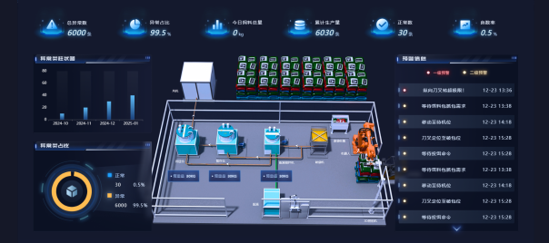 通过3D建模展示内部实时场景,展示生产数据以及现有具备数据上传功能的数据和设备 |