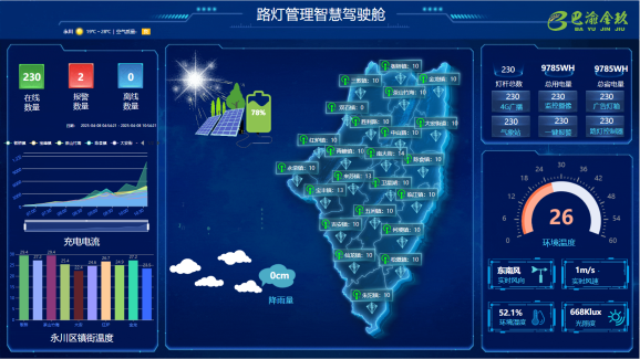 展示路灯在线数量,分布情况,充电电流情况,报警情况以及环境参数 |