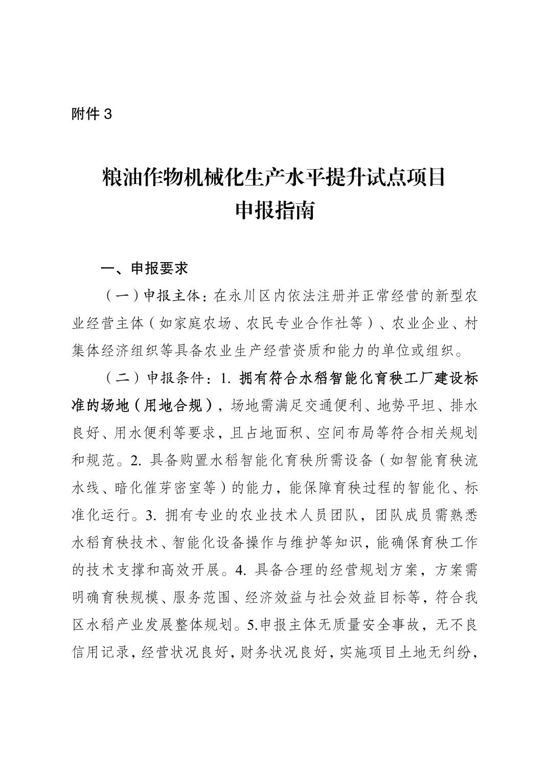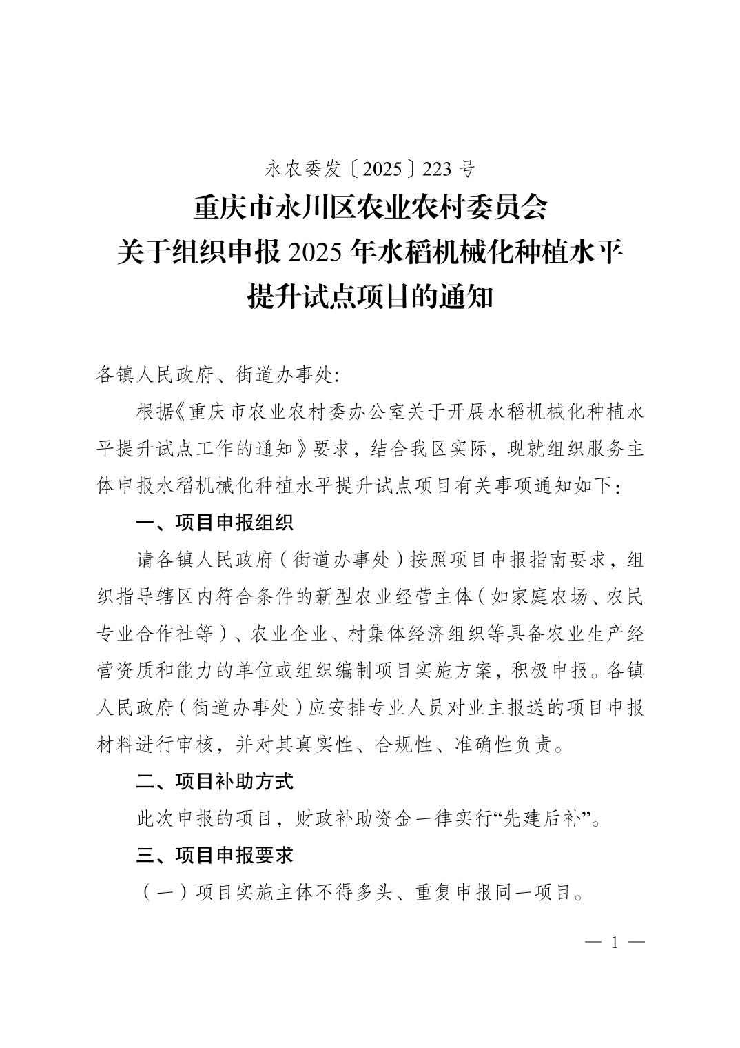 重庆市永川区农业农村委员会关于组织申报2025年水稻机械化种植水平提升试点项目的通知