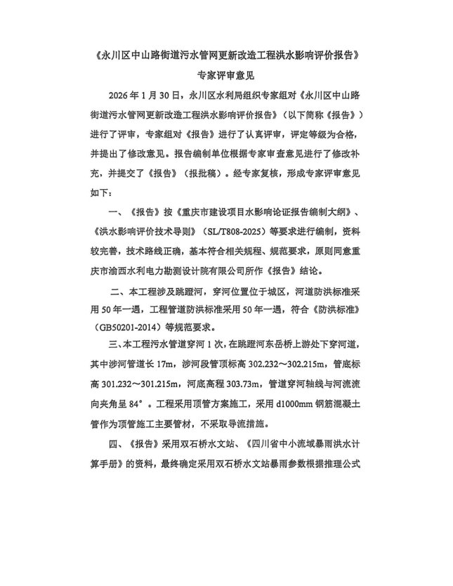 一、项目涉河工程位于永川区中山路街道,涉及河道为跳蹬河;同意河道防洪标准采用50年一遇,管道设计洪水标准采用50年一遇。