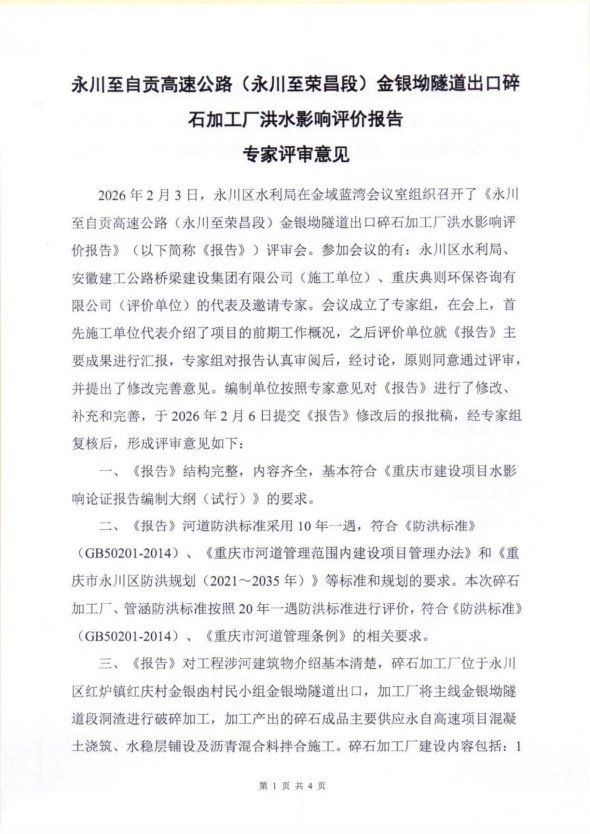 根据你单位关于永川至自贡高速公路(永川至荣昌段)金银坳隧道出口碎石加工厂洪水影响评价的行政许可申请(项目代码:5001182026020131020),我局组织专家对《永川至自贡高速公路(永川至荣昌段)金银坳隧道出口碎石加工厂洪水影响评价报告》进行了审查。根据《行政许可法》第三十八条第一款、《水行政许可实施办法》第三十二条第一项规定和专家评审意见,现就该工程洪水影响评价作出准予行政许可决定。