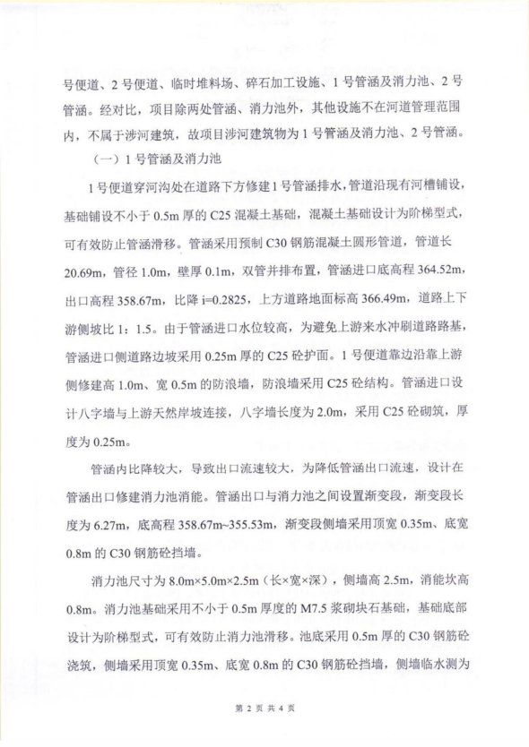 项目涉河建筑物为1号管涵及消力池、2号管涵。