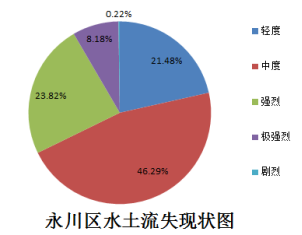 永川区属于重庆市水土保持区划中的渝西方山丘陵保土人居环境维护区,水土流失类型主要为水力侵蚀,局部地区存在重力侵蚀。根据《重庆市水土保持公报(2016年)》,永川区水土流失面积为299.78km2,占全区幅员面积的19.03%。其中轻度流失64.38km2,占流失面积的21.48%;中度流失138.78km2,占流失面积的46.29%;强度流失71.42km2,占流失面积的23.82%;极强度流失24.53km2,占流失面积的8.18%;剧烈流失0.67km2,占流失面积的0.22%,年平均土壤侵蚀量达25.31万t,侵蚀模数844t/km2.a。