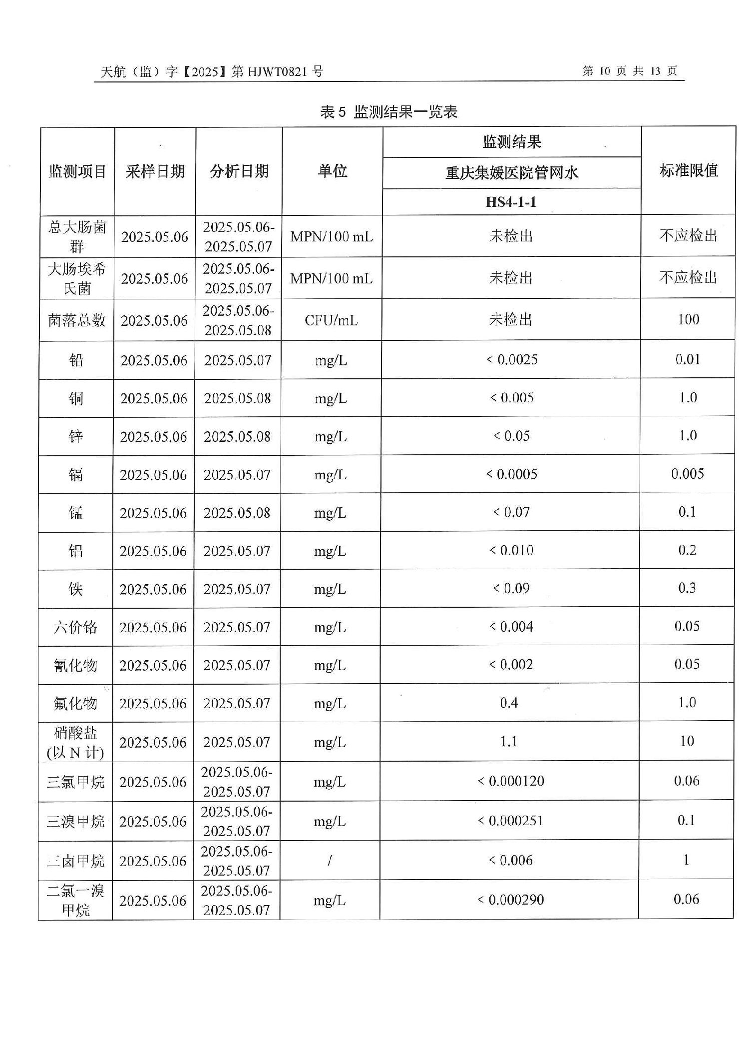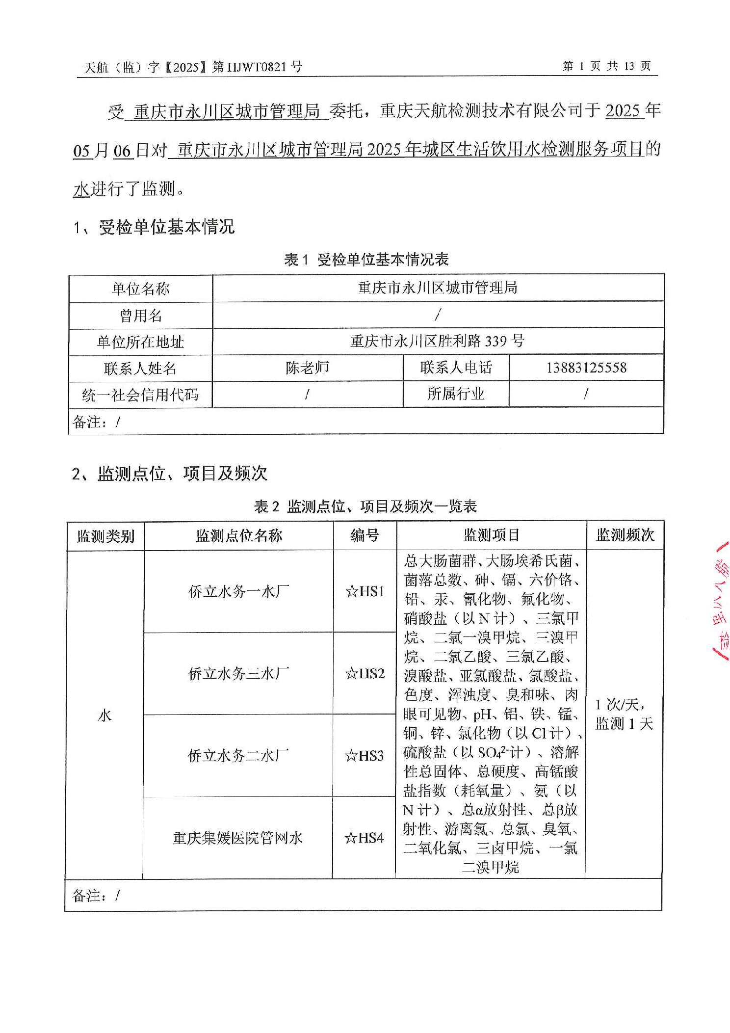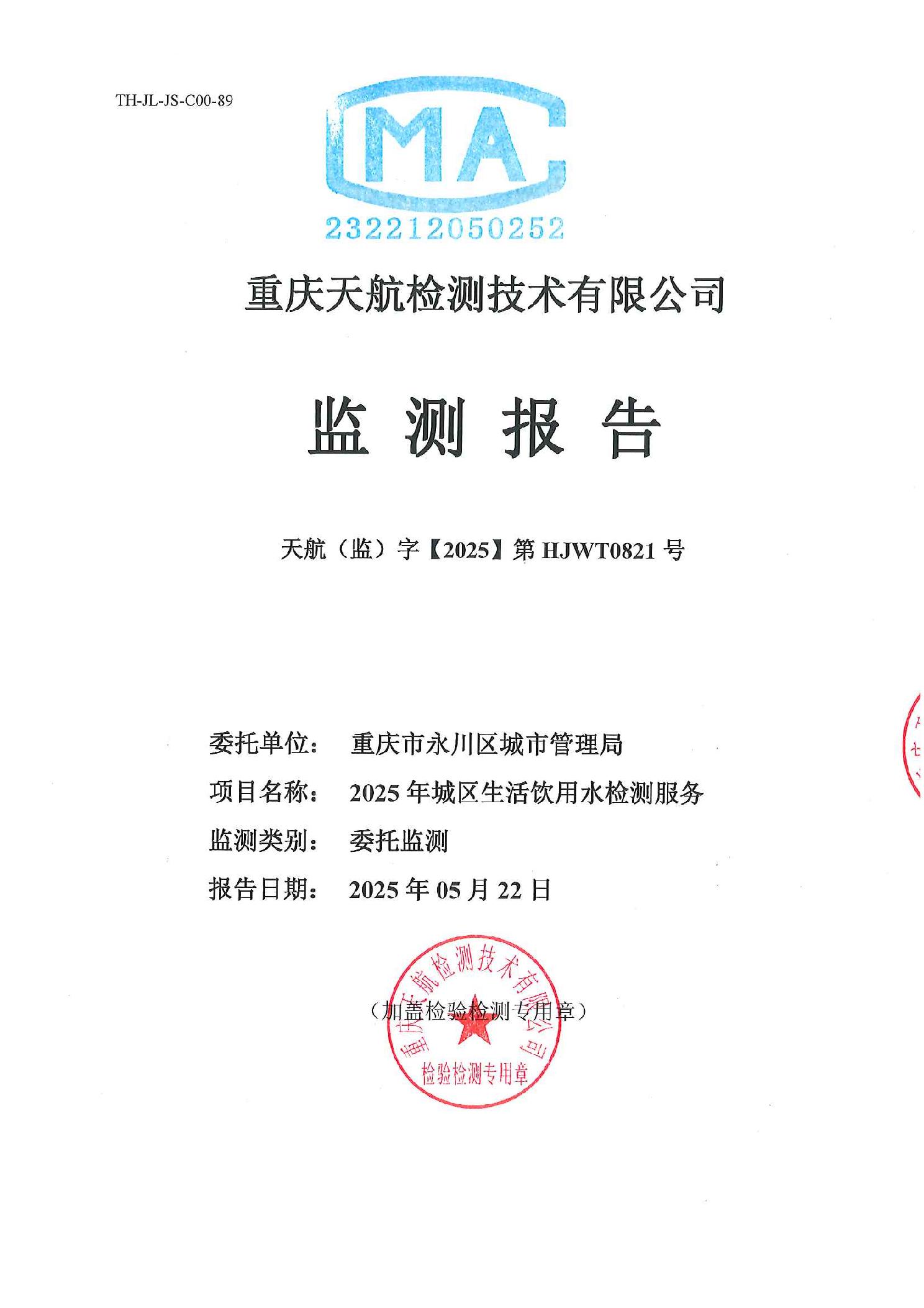 重庆市永川区城市管理局关于2025年5月永川城区水质(出厂水、管网水)检测报告的公示