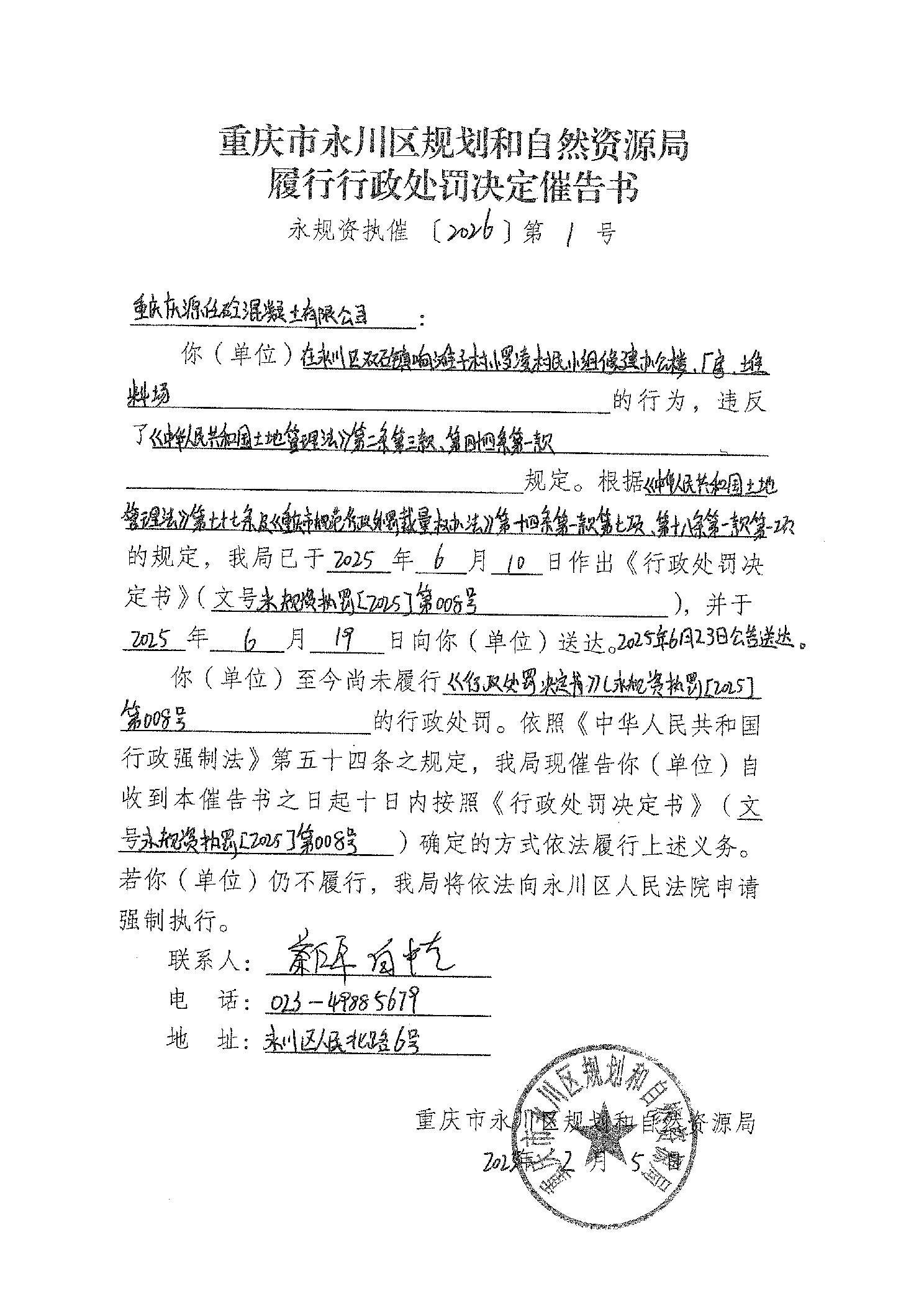 详见《重庆市永川区规划和自然资源局履行行政处罚决定催告书》(永规资执催〔2026〕第1号)