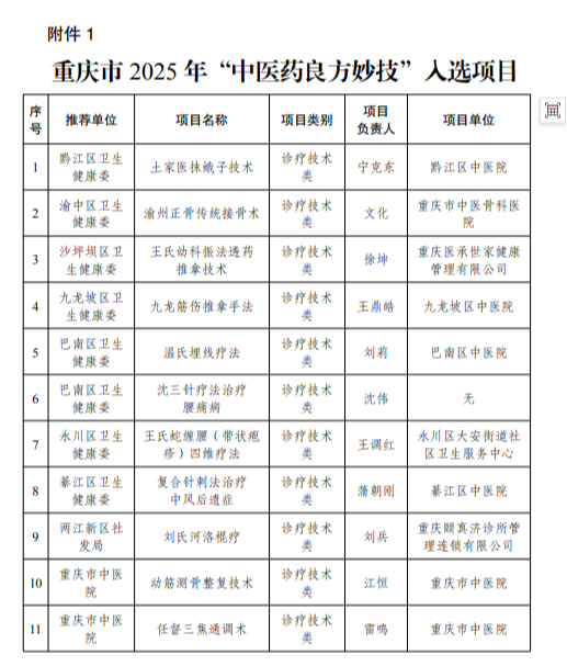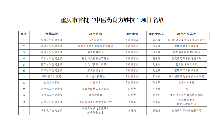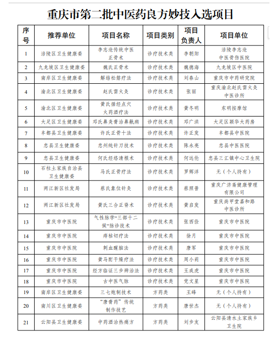 重庆市“中医药良方妙技”挖掘整理和推广应用工作,旨在推动传统医药类非物质文化遗产的保护和传承,更好地服务人民群众健康。通过挖掘筛选一批特色鲜明、疗效显著的中医药特色诊疗技术,整理开发一批疗效确切、使用安全的中药秘方验方和炮制技术,引进培育一批技术成熟、方法独特、疗效突出的中医药传统技术或创新技术项目,保护利用一批中医药古籍文献资料,宣传推介一批医德高尚、在某一领域具有独特技法的中医传承人,使散落在我市的传统中医药瑰宝得到收集整理利用并加以保护传承,逐步形成具有巴渝特色的中医药特色疗法数据库。我们将严格遵守保密原则,充分尊重持有人、持有单位的公开意愿。