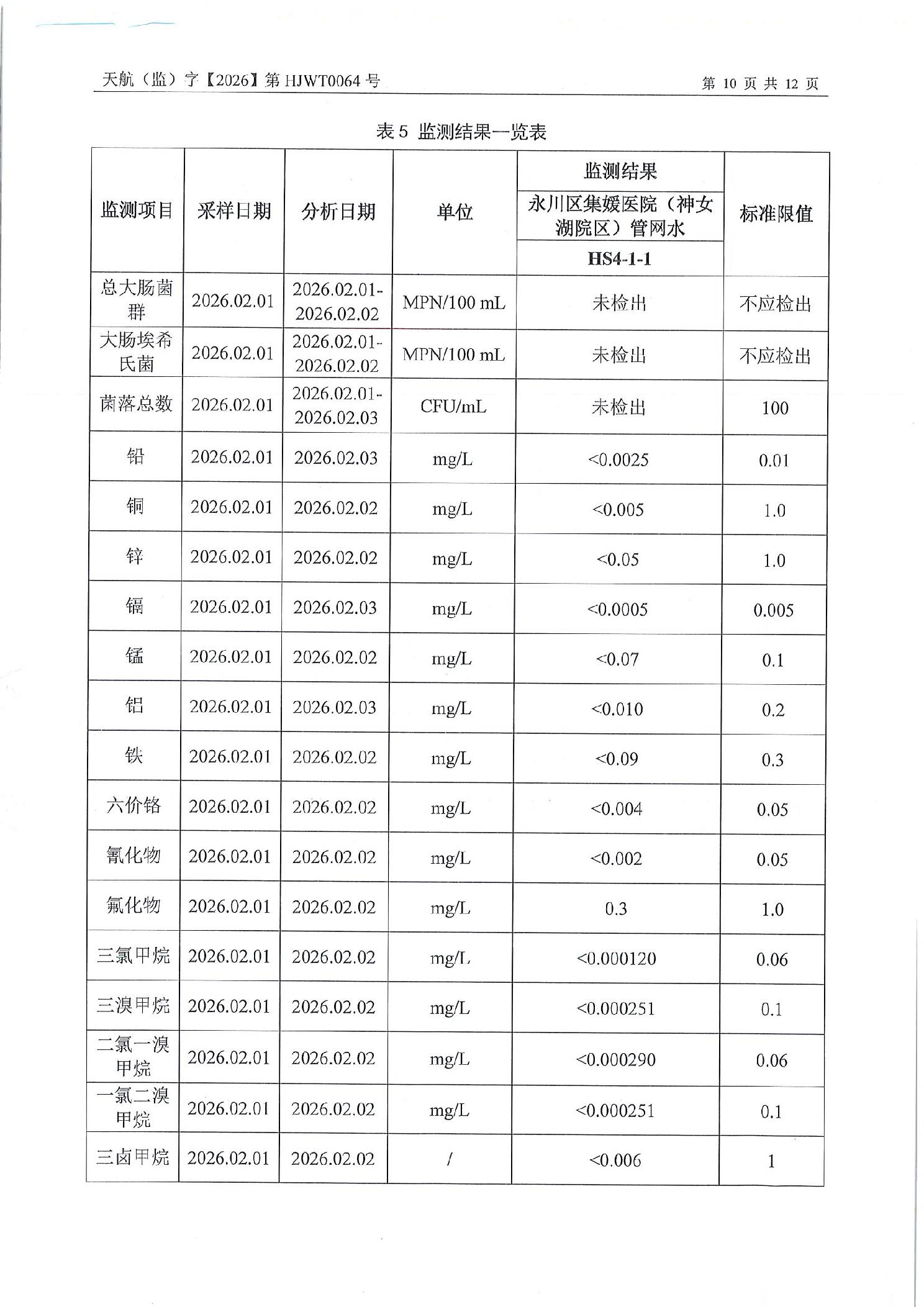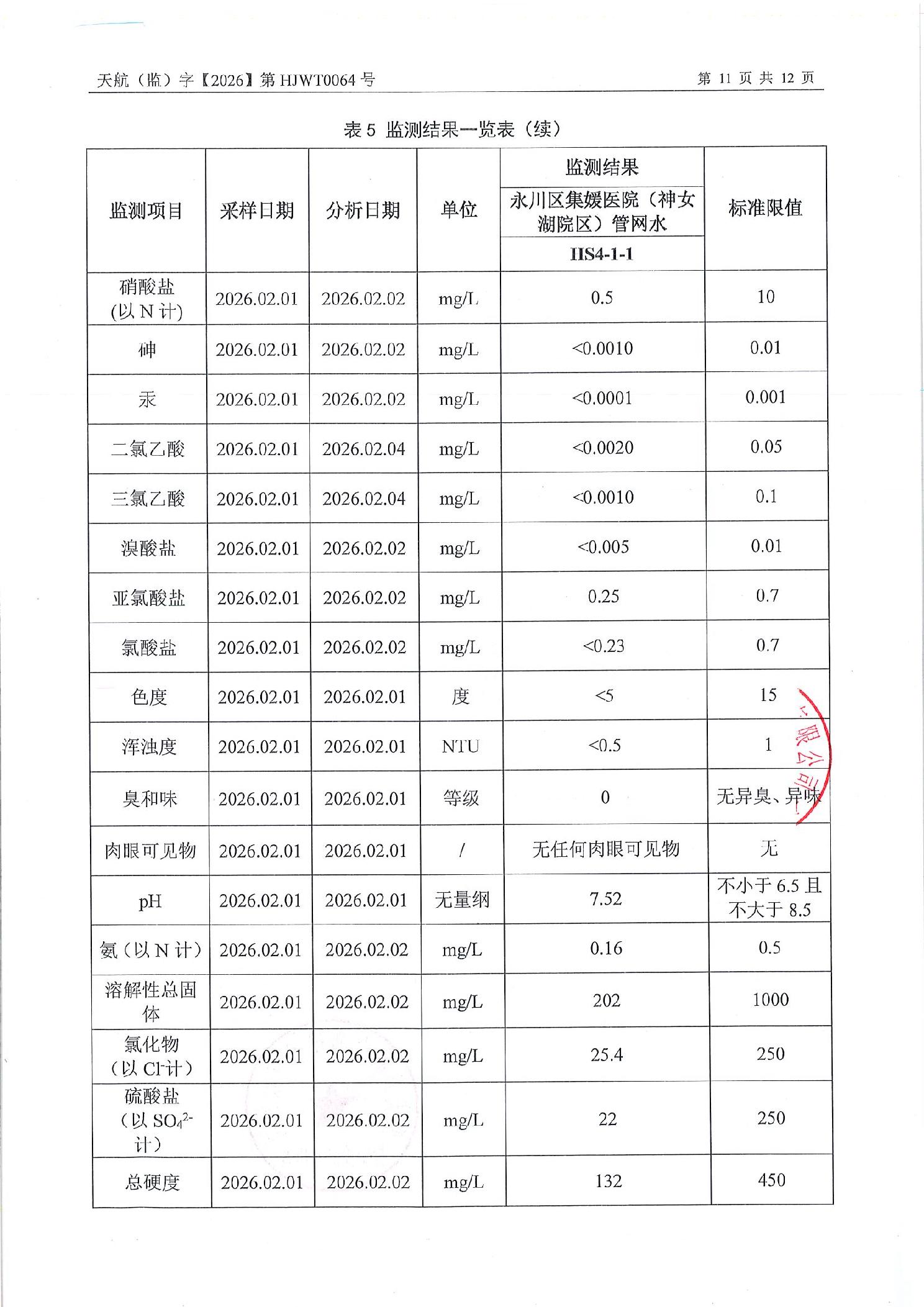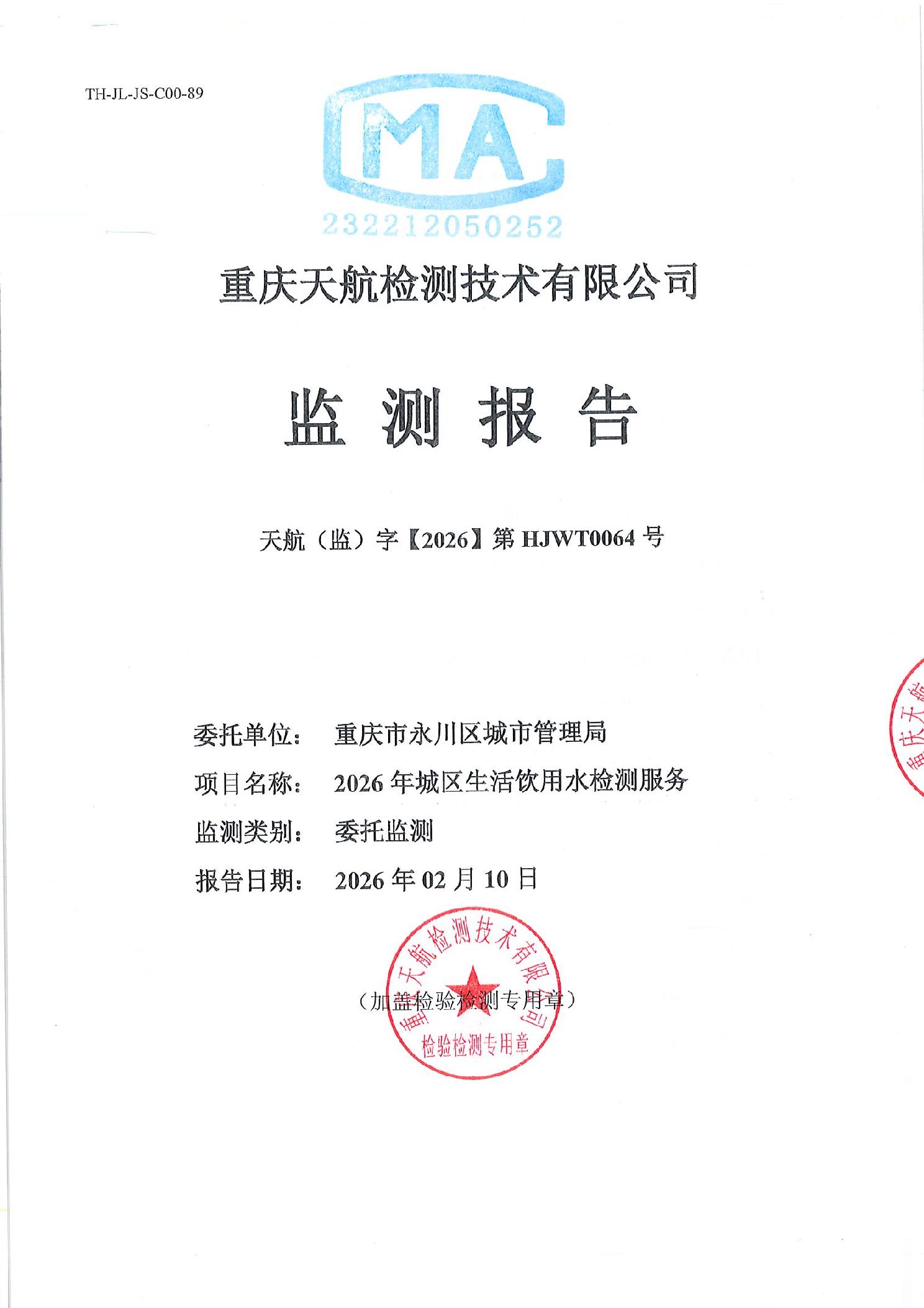 重庆市永川区城市管理局关于2026年2月永川城区水质(出厂水、管网水)检测报告的公示