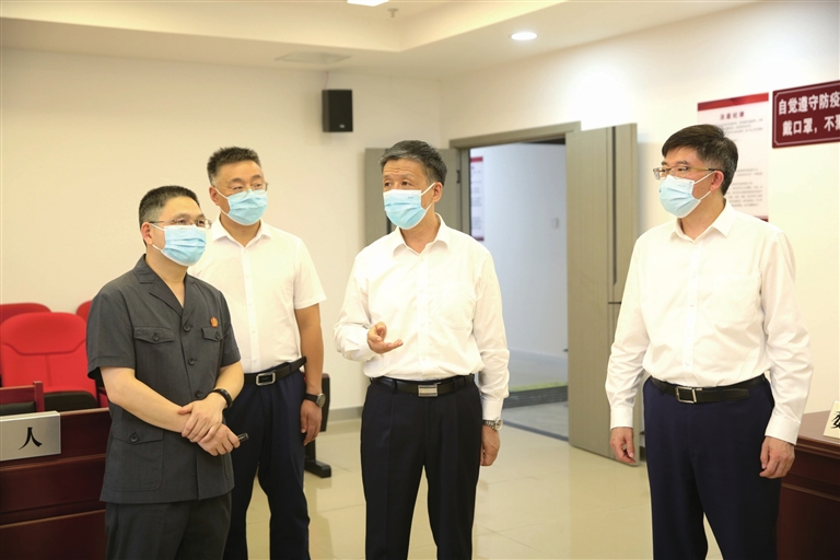 8月24日,市高级人民法院党组书记、院长李永利来永川,调研持续优化法治化营商环境和人民法庭建设工作。区委书记张智奎,区人大常委会主任潘文峰陪同调研。图为李永利一行在永川区社会矛盾纠纷联合调处中心调研。渝西都市报记者 袁卿予 摄