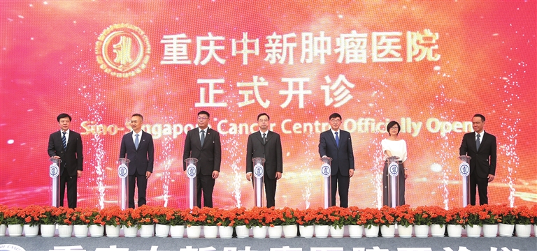 是日上午10时58分,但彦铮、陈子勤、张玉、唐慎、张智奎、常晓勇等共同按下开诊仪式能量柱启动键,宣布重庆中新肿瘤医院正式开诊。