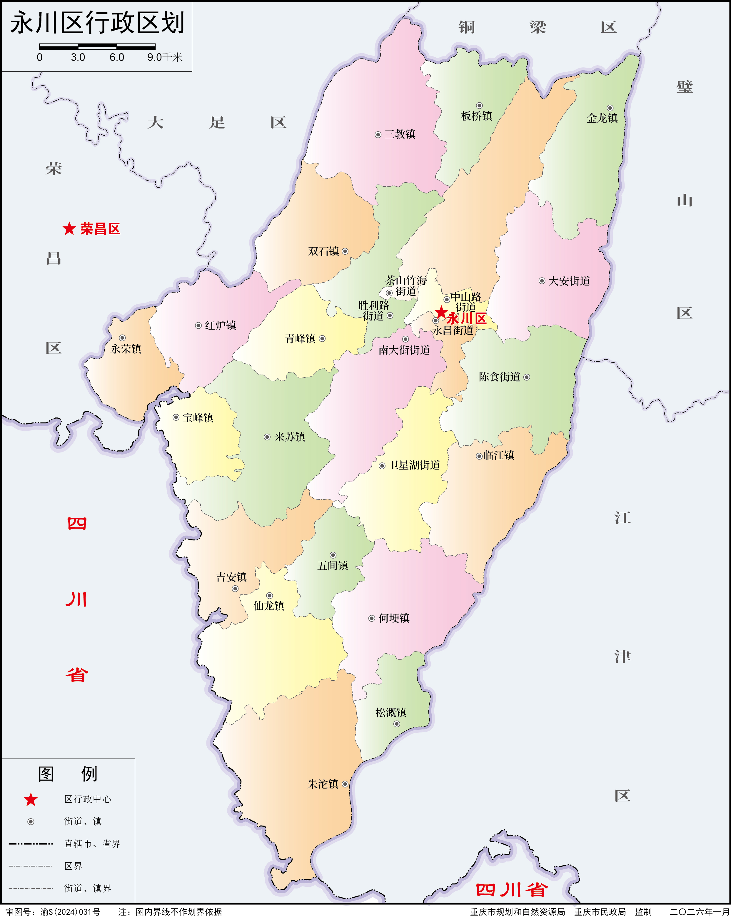 永川位于长江上游北岸,重庆西南部,东接璧山、江津区,西连大足、荣昌区,北与铜梁区接壤,南与四川省泸县、合江县相邻。地处东经105°38′~106°05′、北纬28°56′~29°34′。幅员面积1576平方公里,辖16个镇、8个街道,56个社区居委会、206个行政村。