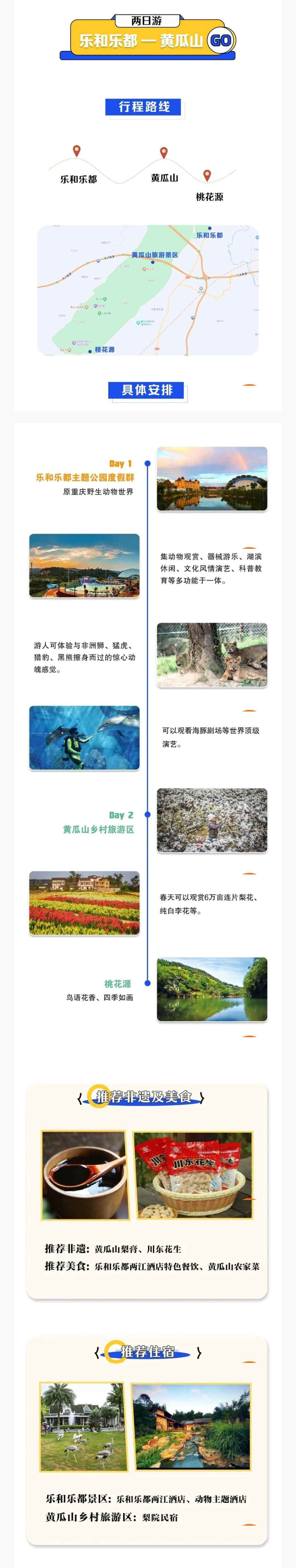 推荐住宿:乐和乐都两江酒店、动物主题酒店(乐和乐都景区内);梨院民宿(黄瓜山乡村旅游区内)