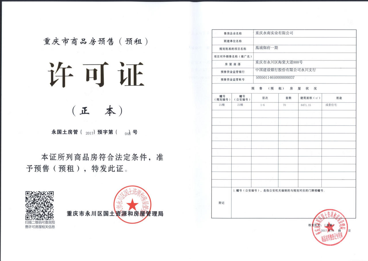 重庆永南实业有限公司开发的凰城御府一期项目,位于重庆市永川区海棠大道888号,该项目21幢已具备商品房预售条件,并取得了《重庆市商品房预售(预租)许可证》,证号:永国土房管(2017)预字第(048)号。