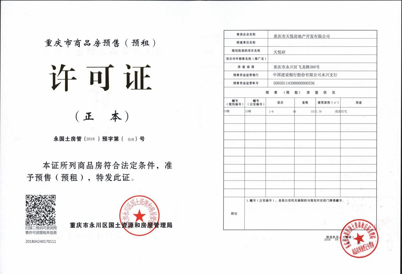 | 标题: | 预售通告-(2018)预字第(018)号(天悦府13幢) | ||||