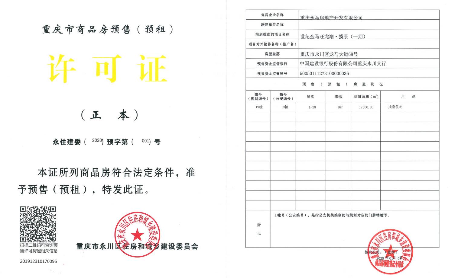 重庆永马房地产开发有限公司开发的世纪金马旺龙湖·揽景(一期)项目,位于重庆市永川区龙马大道68号,该项目19幢已具备商品房预售条件,并取得了《重庆市商品房预售(预租)许可证》,证号:永住建委(2020)预字第(001)号。