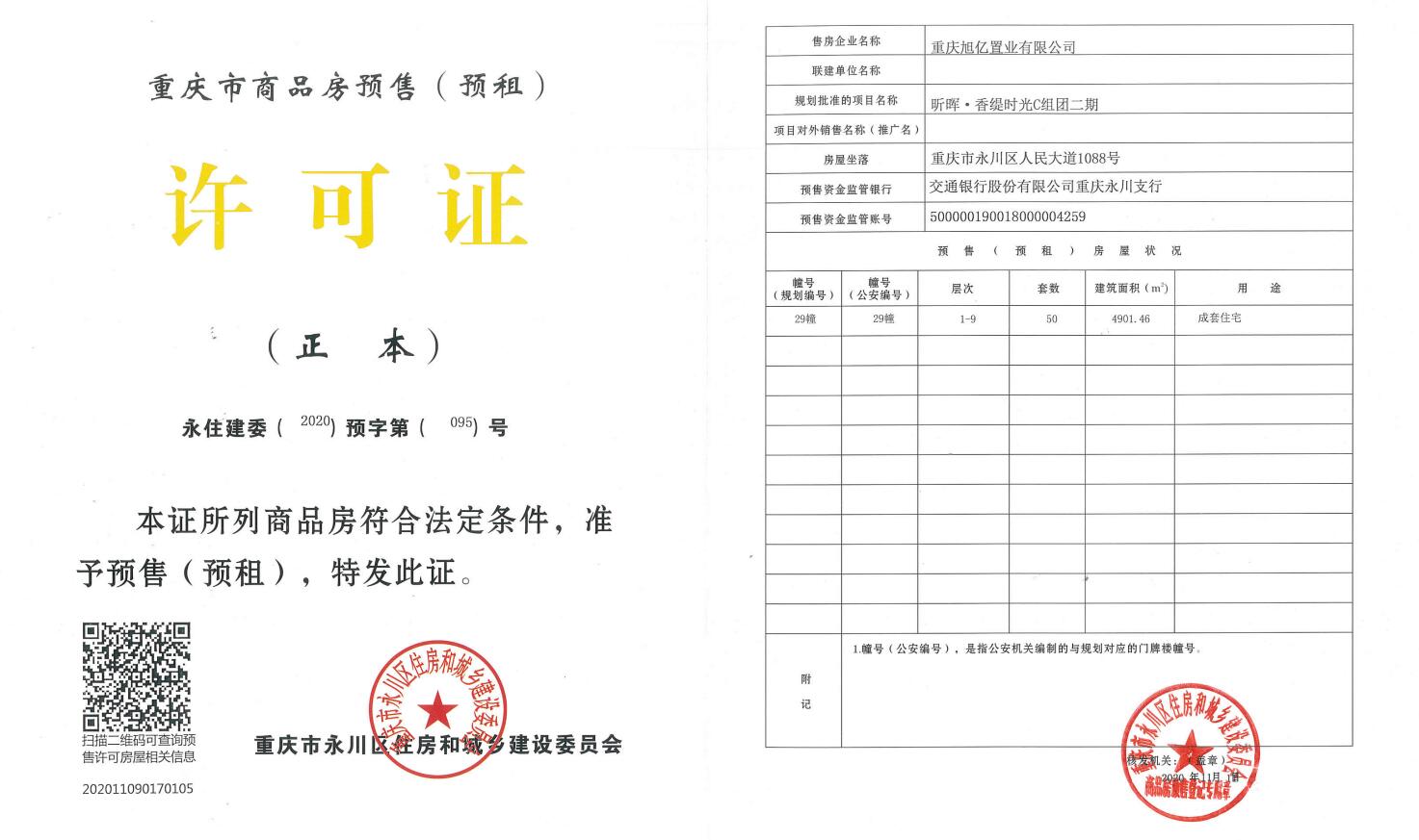重庆旭亿置业有限公司开发的昕晖·香缇时光C组团二期项目,位于重庆市永川区人民大道1088号,该项目29幢已具备商品房预售条件,并取得了《重庆市商品房预售(预租)许可证》,证号:永住建委(2020)预字第(095)号。
