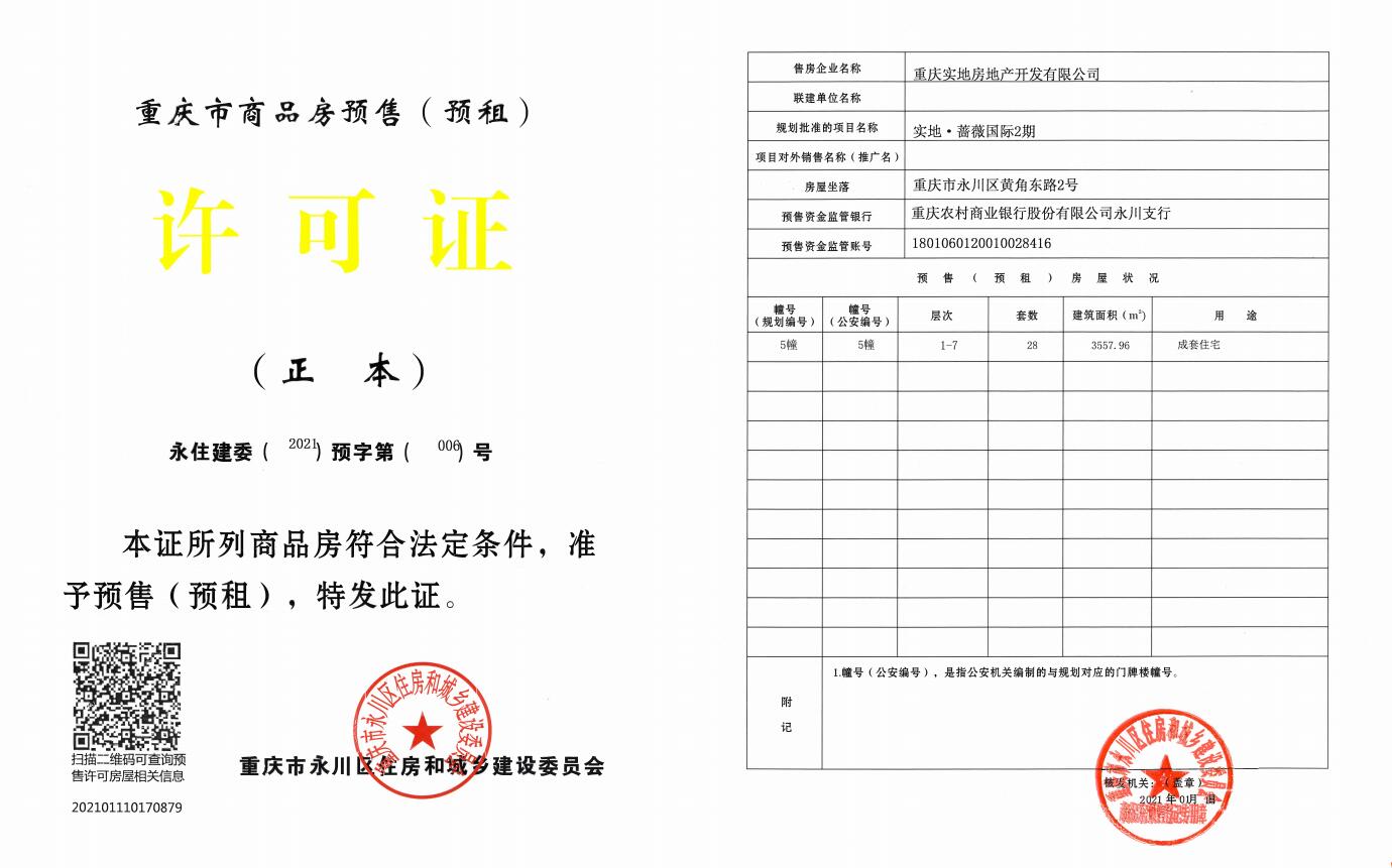 重庆实地房地产开发有限公司开发的实地·蔷薇国际2期项目,位于重庆市永川区黄角东路2号,该项目5幢已具备商品房预售条件,并取得了《重庆市商品房预售(预租)许可证》,证号:永住建委(2021)预字第(006)号。