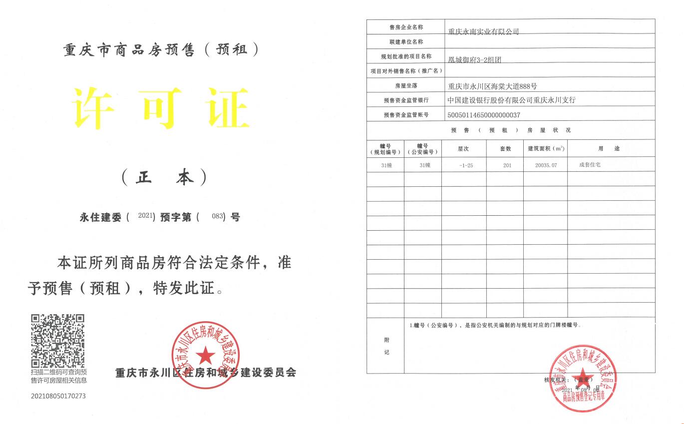 重庆永南实业有限公司开发的凰城御府3-2组团项目,位于重庆市永川区海棠大道888号,该项目31幢已具备商品房预售条件,并取得了《重庆市商品房预售(预租)许可证》,证号:永住建委(2021)预字第(083)号。