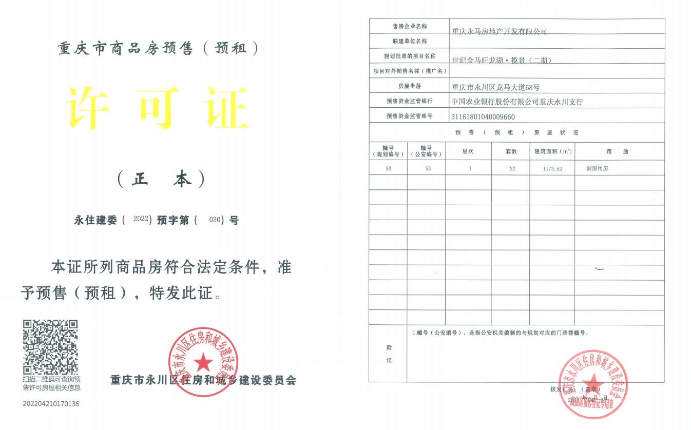 重庆永马房地产开发有限公司开发的世纪金马旺龙湖·揽景(二期)项目,位于重庆市永川区龙马大道68号,该项目S3幢已具备商品房预售条件,并取得了《重庆市商品房预售(预租)许可证》,证号:永住建委(2022)预字第(030)号。