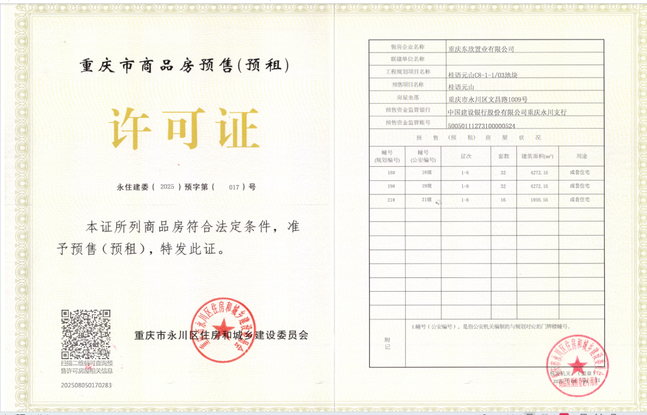重庆东欣置业有限公司开发建设的桂语元山(C8-1-1-03地块)项目,位于重庆市永川区文昌路1009号,该项目18、19、21幢已具备商品房预售条件,并取得了《重庆市商品房预售(预租)许可证》,证号:永住建委(2025)预字第(017)号。
