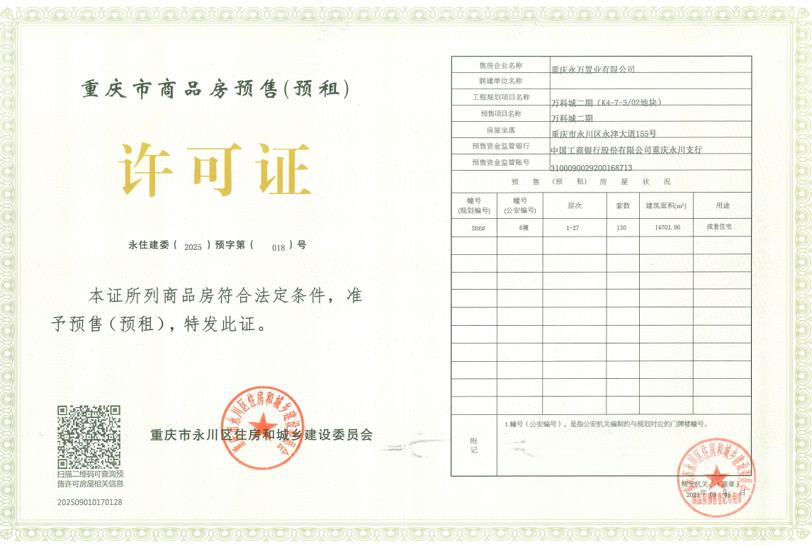 重庆永万置业有限公司开发建设的万科城二期项目,位于重庆市永川区永津大道155号,该项目6幢已具备商品房预售条件,并取得了《重庆市商品房预售(预租)许可证》,证号:永住建委(2025)预字第(018)号。
