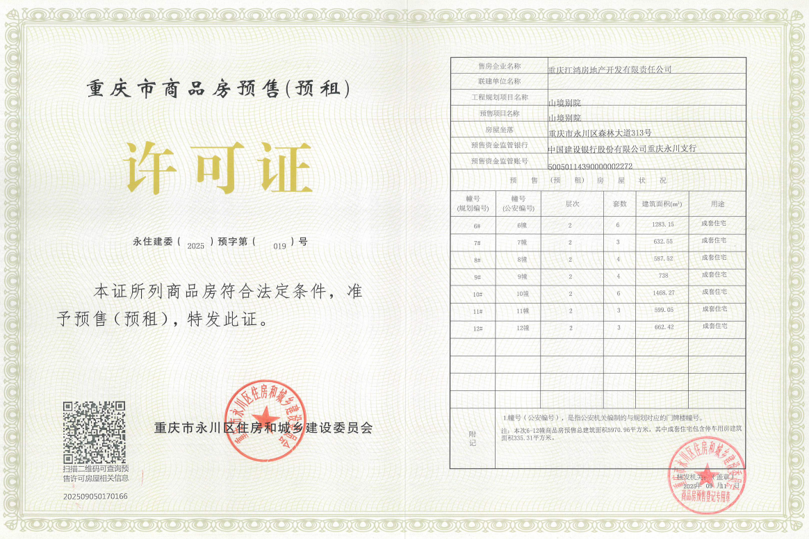 重庆江鸿房地产开发有限责任公司开发建设的山境别院项目,位于重庆市永川区森林大道313号,该项目6、7、8、9、10、11、12幢已具备商品房预售条件,并取得了《重庆市商品房预售(预租)许可证》,证号:永住建委(2025)预字第(019)号。