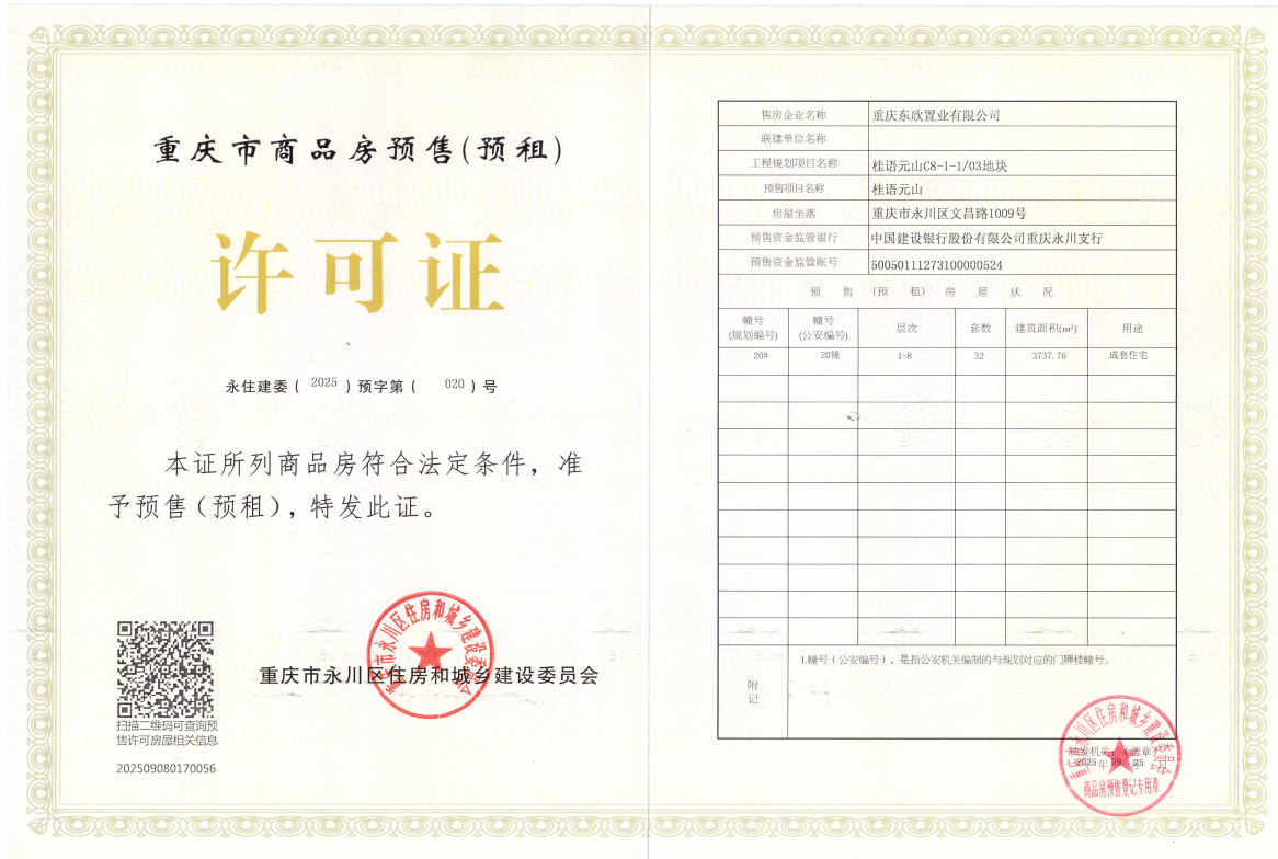 重庆东欣置业有限公司开发建设的桂语元山(C8-1-1-03地块)项目,位于重庆市永川区文昌路1009号,该项目20幢已具备商品房预售条件,并取得了《重庆市商品房预售(预租)许可证》,证号:永住建委(2025)预字第(020)号。