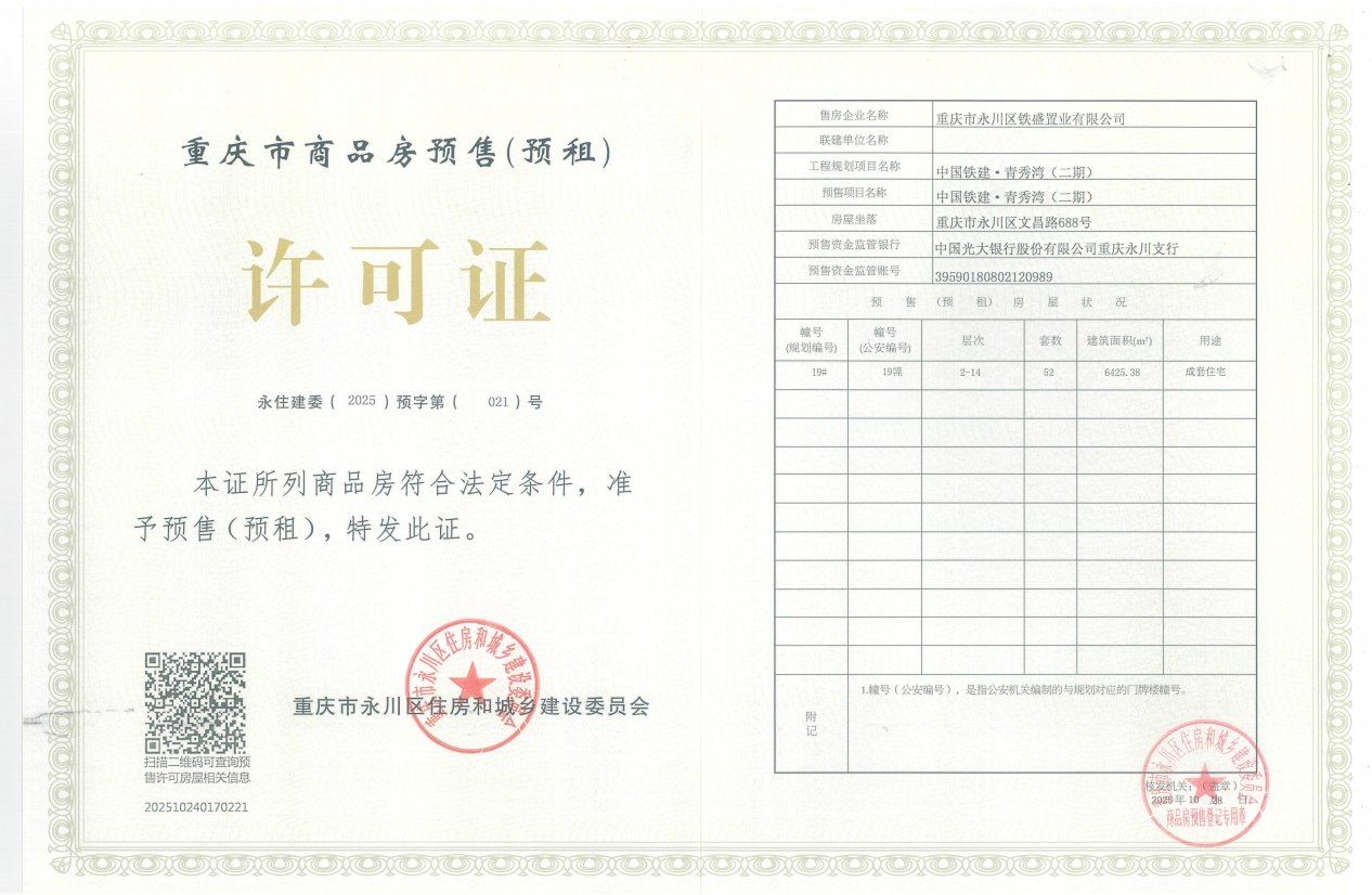 重庆市永川区铁盛置业有限公司开发建设的中国铁建·青秀湾(二期)项目,位于重庆市永川区文昌路688号,该项目19幢已具备商品房预售条件,并取得了《重庆市商品房预售(预租)许可证》,证号:永住建委(2025)预字第(021)号。