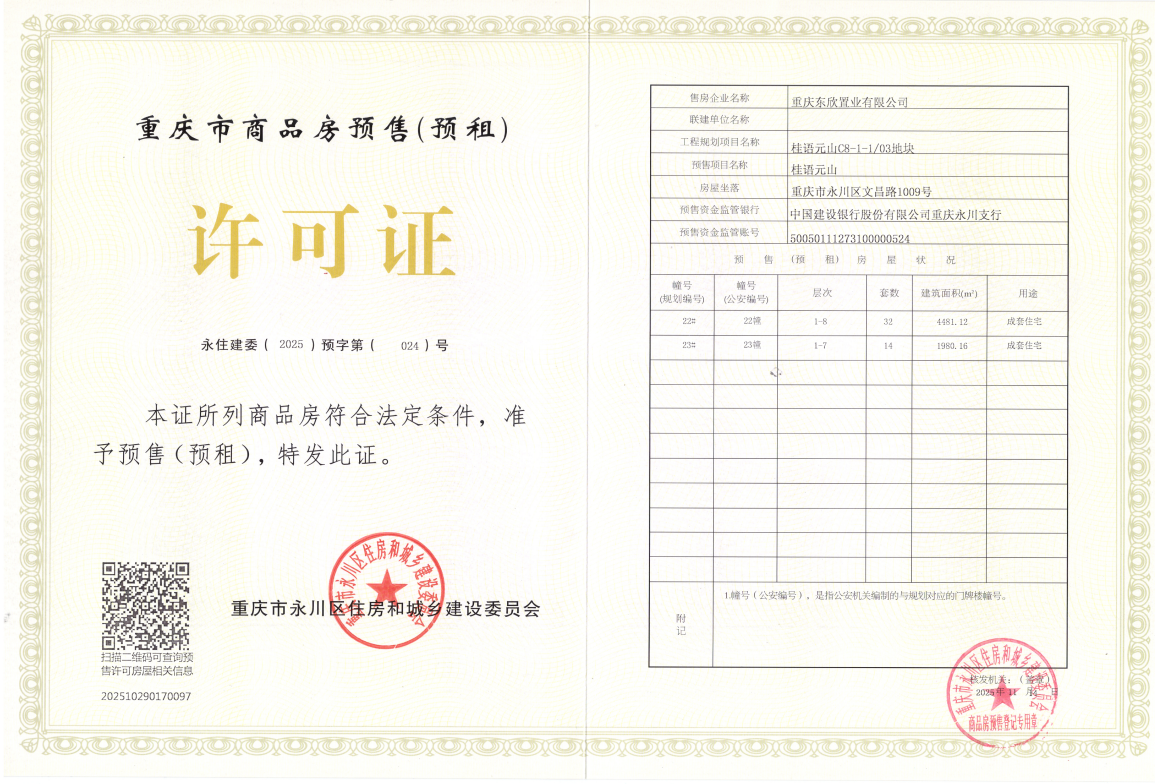 重庆东欣置业有限公司开发建设的桂语元山(C8-1-1-03地块)项目,位于重庆市永川区文昌路1009号,该项目22、23幢已具备商品房预售条件,并取得了《重庆市商品房预售(预租)许可证》,证号:永住建委(2025)预字第(024)号。