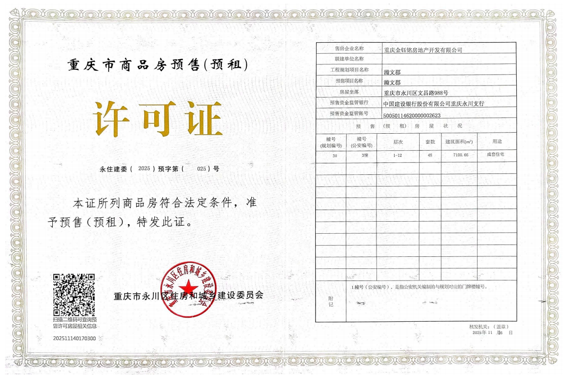 重庆金钰铭房地产开发有限公司开发建设的瀚文郡项目,位于重庆市永川区文昌路988号,该项目3幢已具备商品房预售条件,并取得了《重庆市商品房预售(预租)许可证》,证号:永住建委(2025)预字第(025)号。