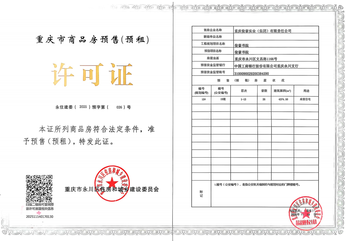 重庆俊豪实业(集团)有限责任公司开发建设的俊豪书院项目,位于重庆市永川区文昌路1166号,该项目15幢已具备商品房预售条件,并取得了《重庆市商品房预售(预租)许可证》,证号:永住建委(2025)预字第(026)号。