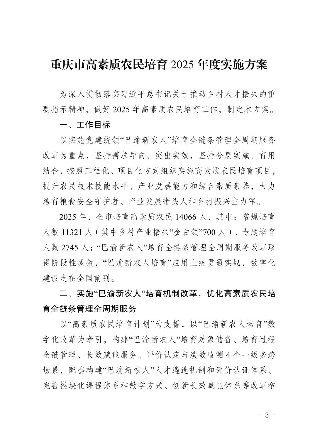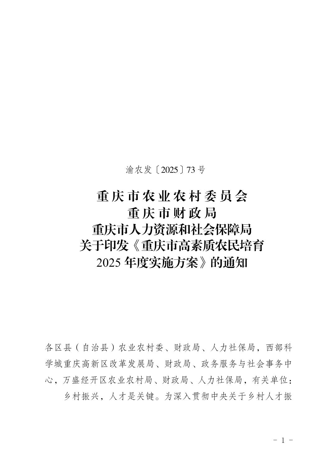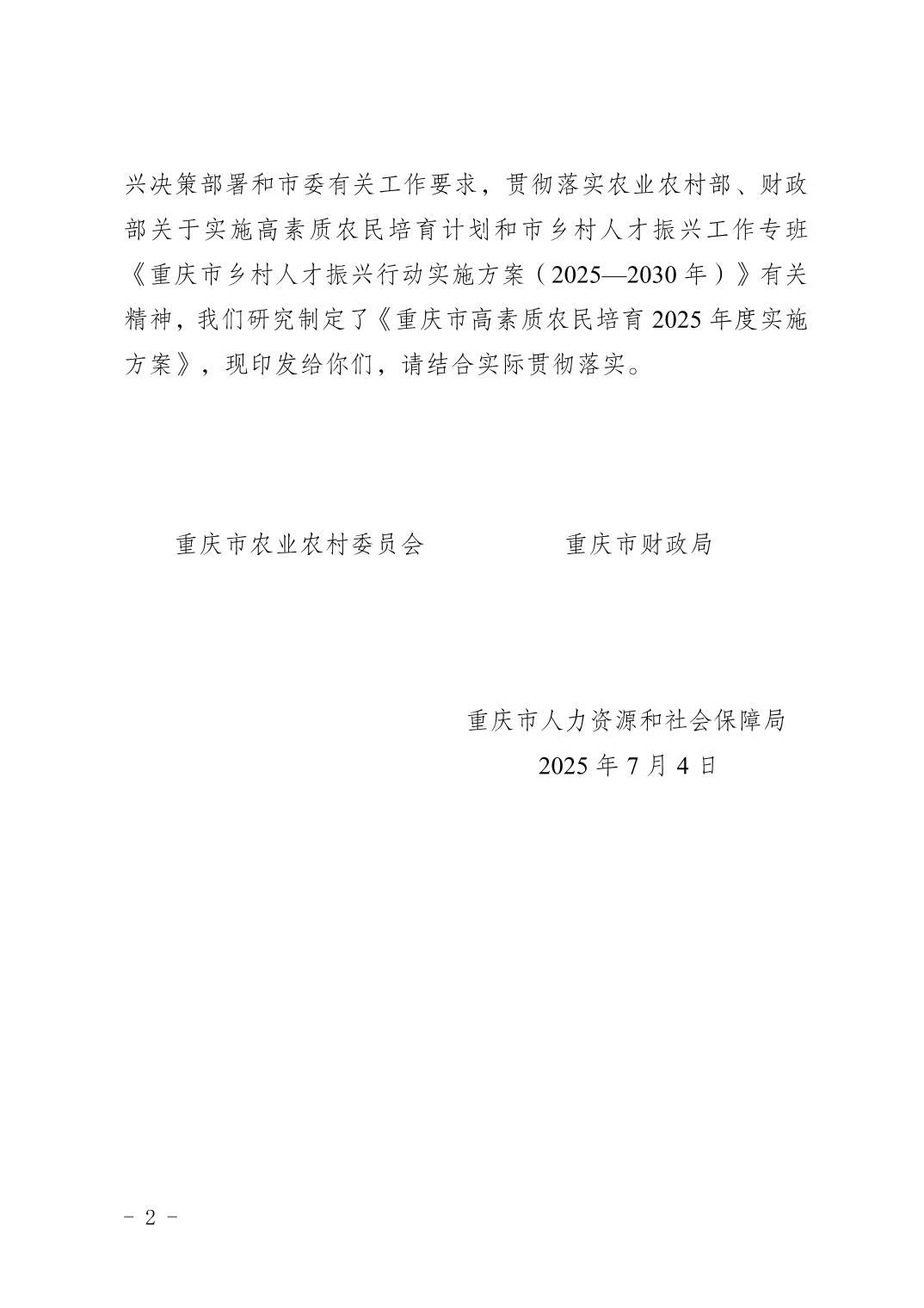 重庆市农业农村委员会 重庆市财政局 重庆市人力资源和社会保障局关于印发《重庆市高素质农民培育2025年度实施方案》的通知
