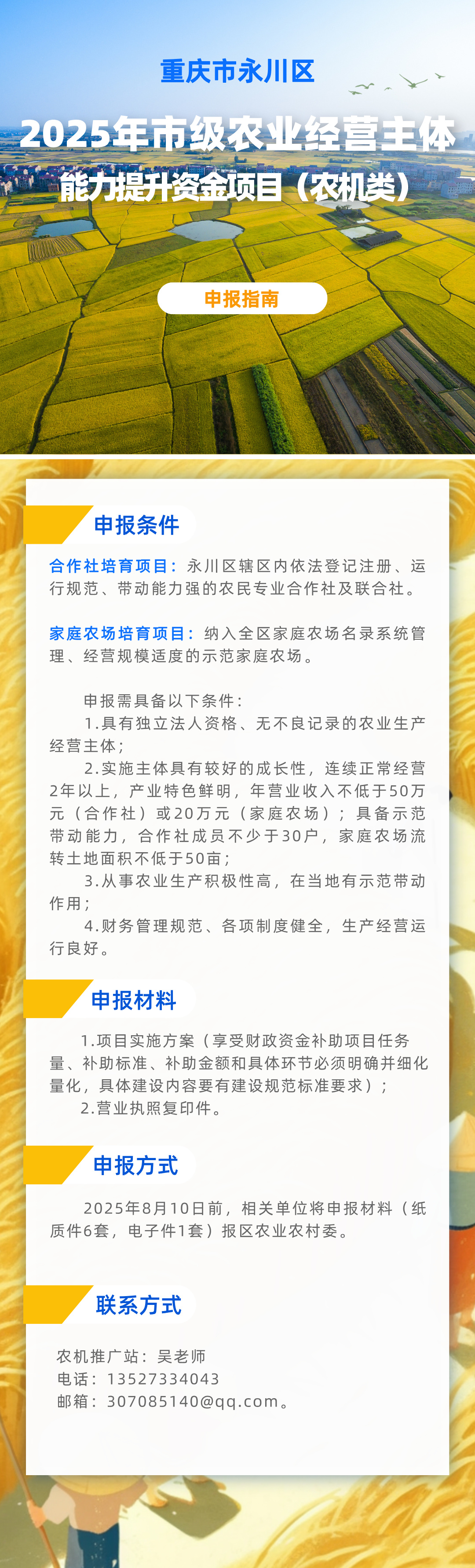 重庆市永川区农业农村委员会关于组织申报2025年市级农业经营主体能力提升资金项目(农机类)的通知