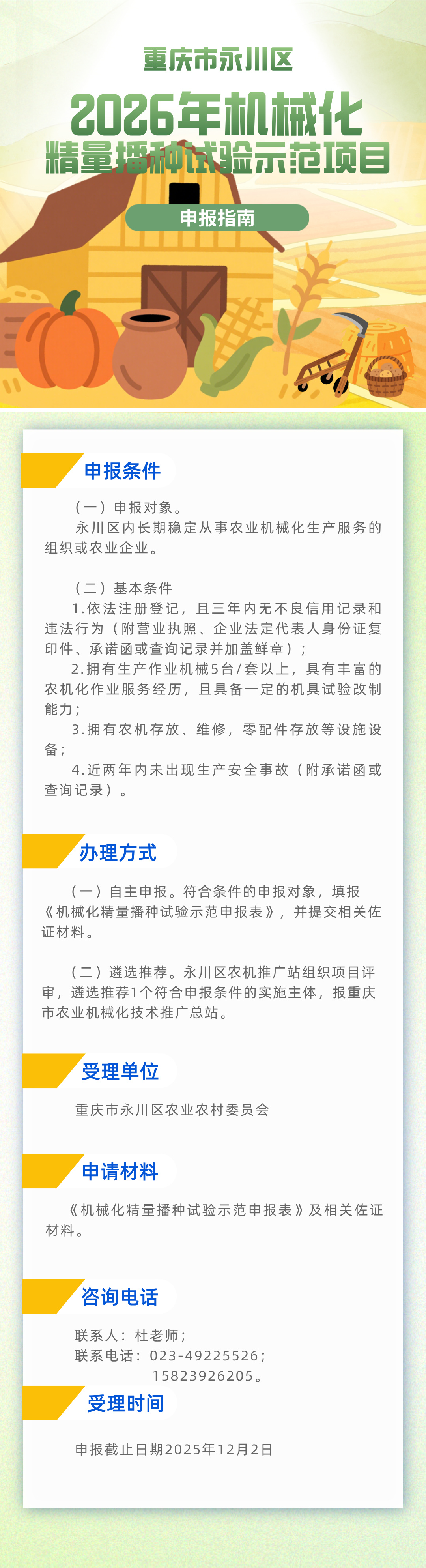 重庆市永川区农业农村委员会关于组织申报2026年机械化精量播种试验示范项目的通知