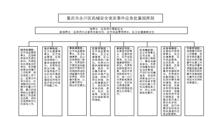 2.1.1 药械安全突发事件发生后,区市场监管局报请区政府启动应急预案,在区委、区政府的统一领导下,成立区药械安全突发事件应急处置指挥部(以下简称区指挥部)。区指挥部实行指挥长负责制,由指挥长、副指挥长、成员组成。指挥长由分管药品安全的区政府副区长担任,副指挥长由区政府办公室有关副主任以及区市场监管局、区卫生健康委主要负责人担任,区级有关部门、有关单位和事发地镇街有关负责人为成员。区指挥部组成及职责见附件1。